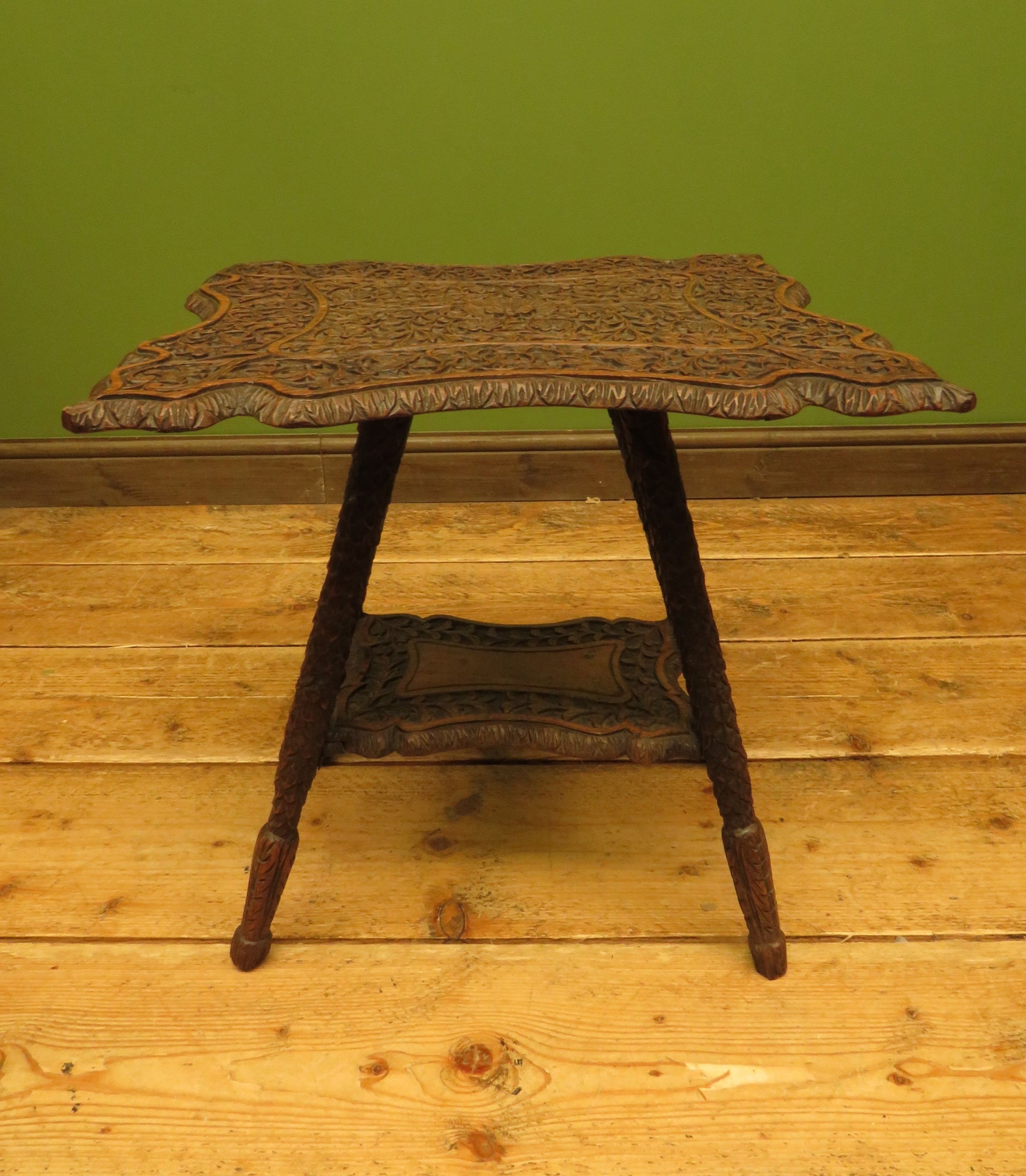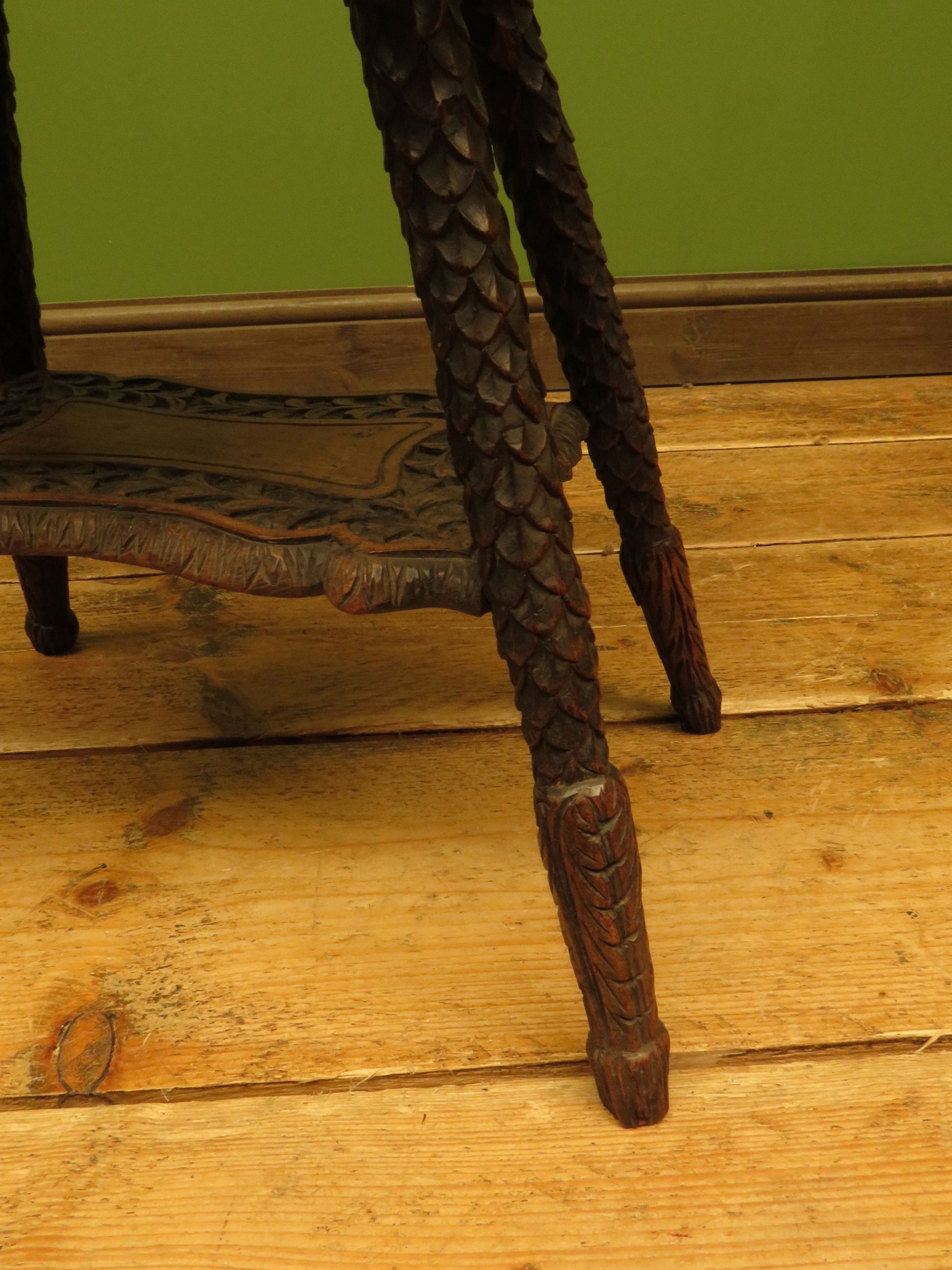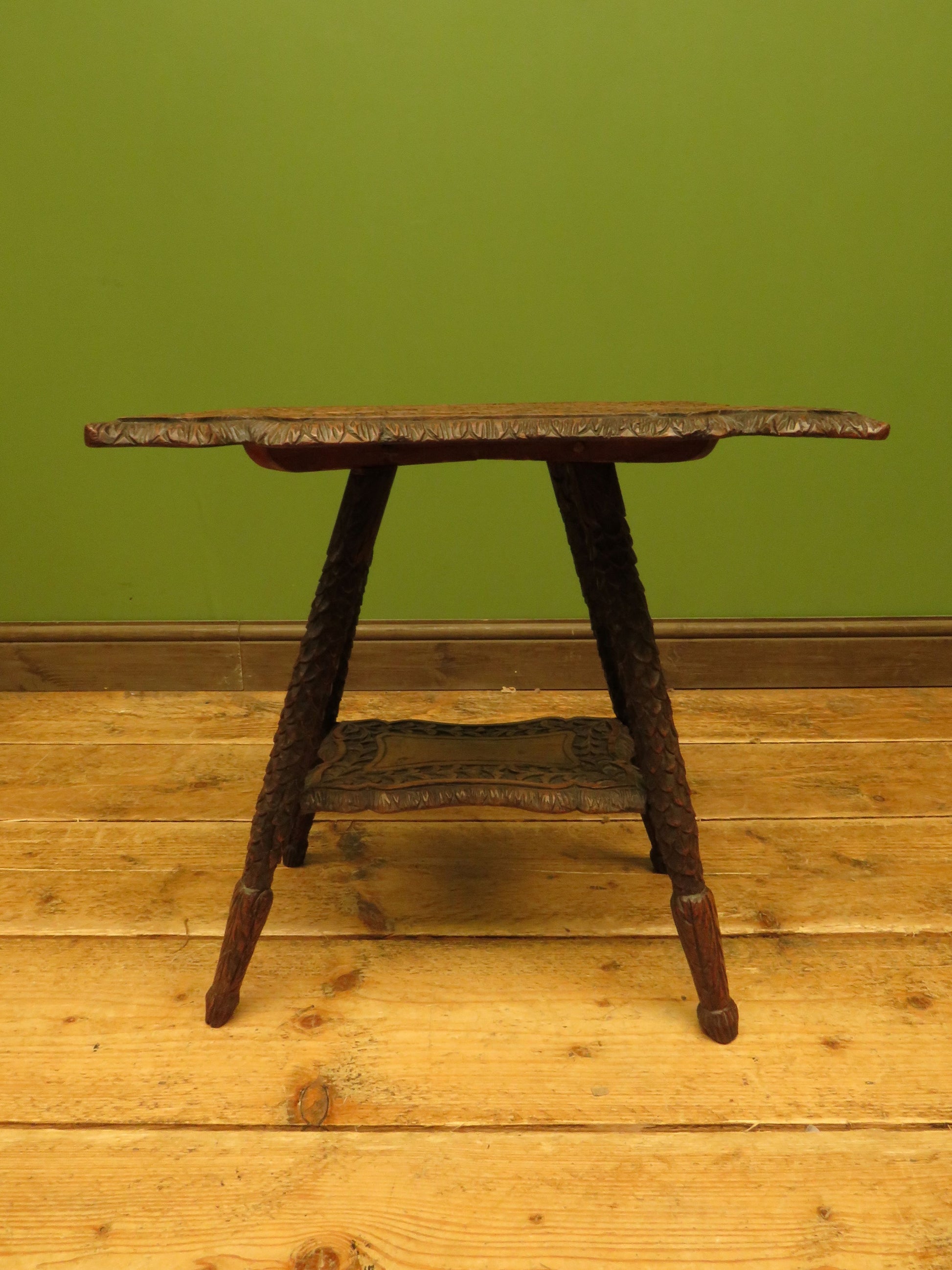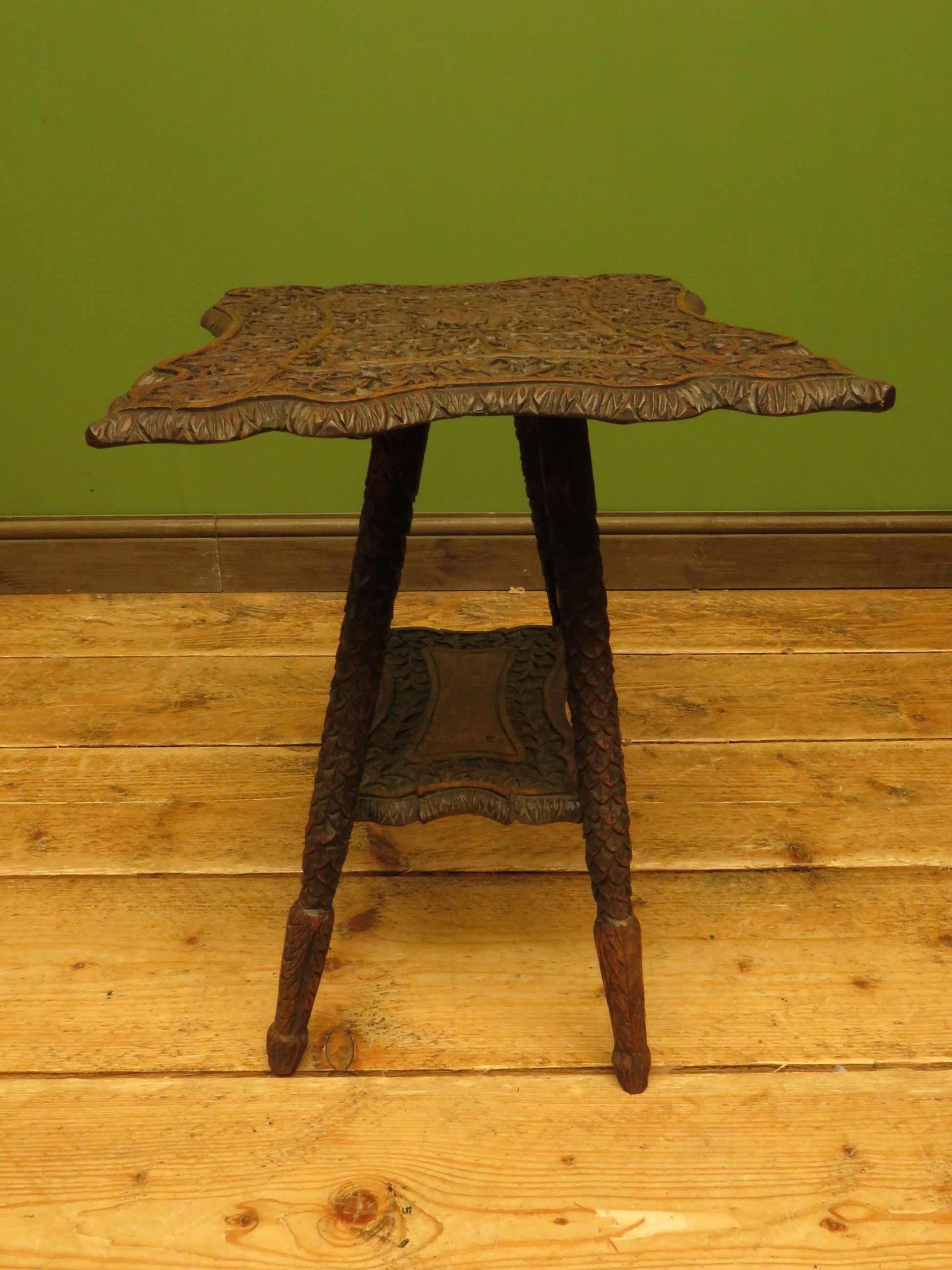 The table has a shaped top and under-tier and is heavily carved, the top is set on slanted legs which are carved to resemble scales.