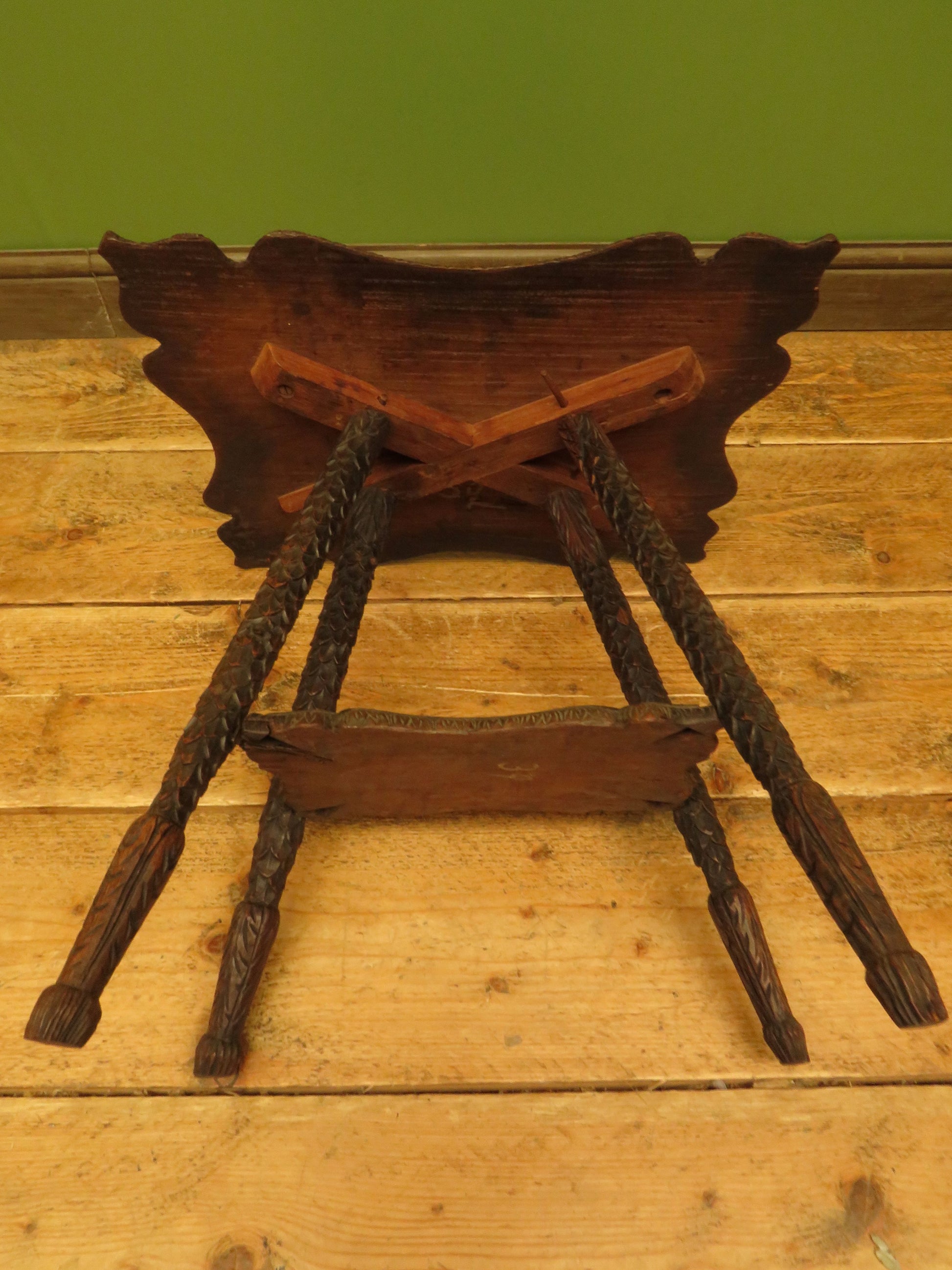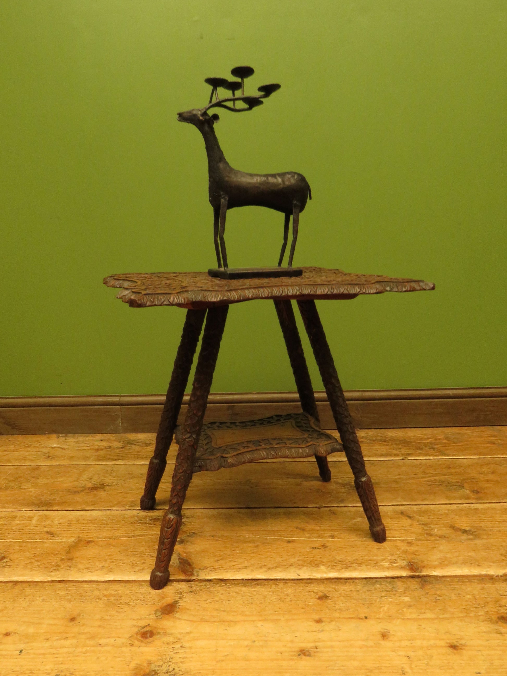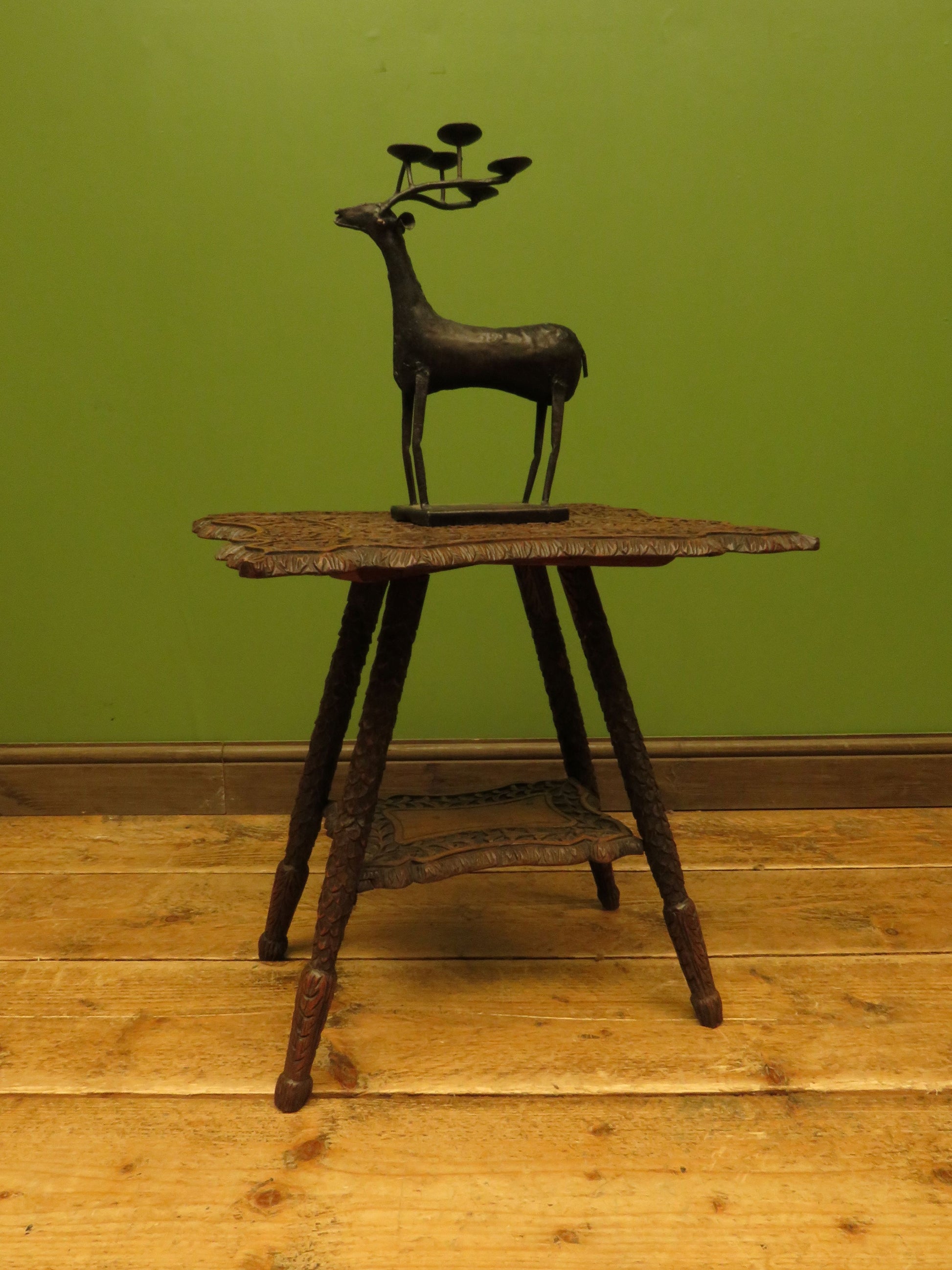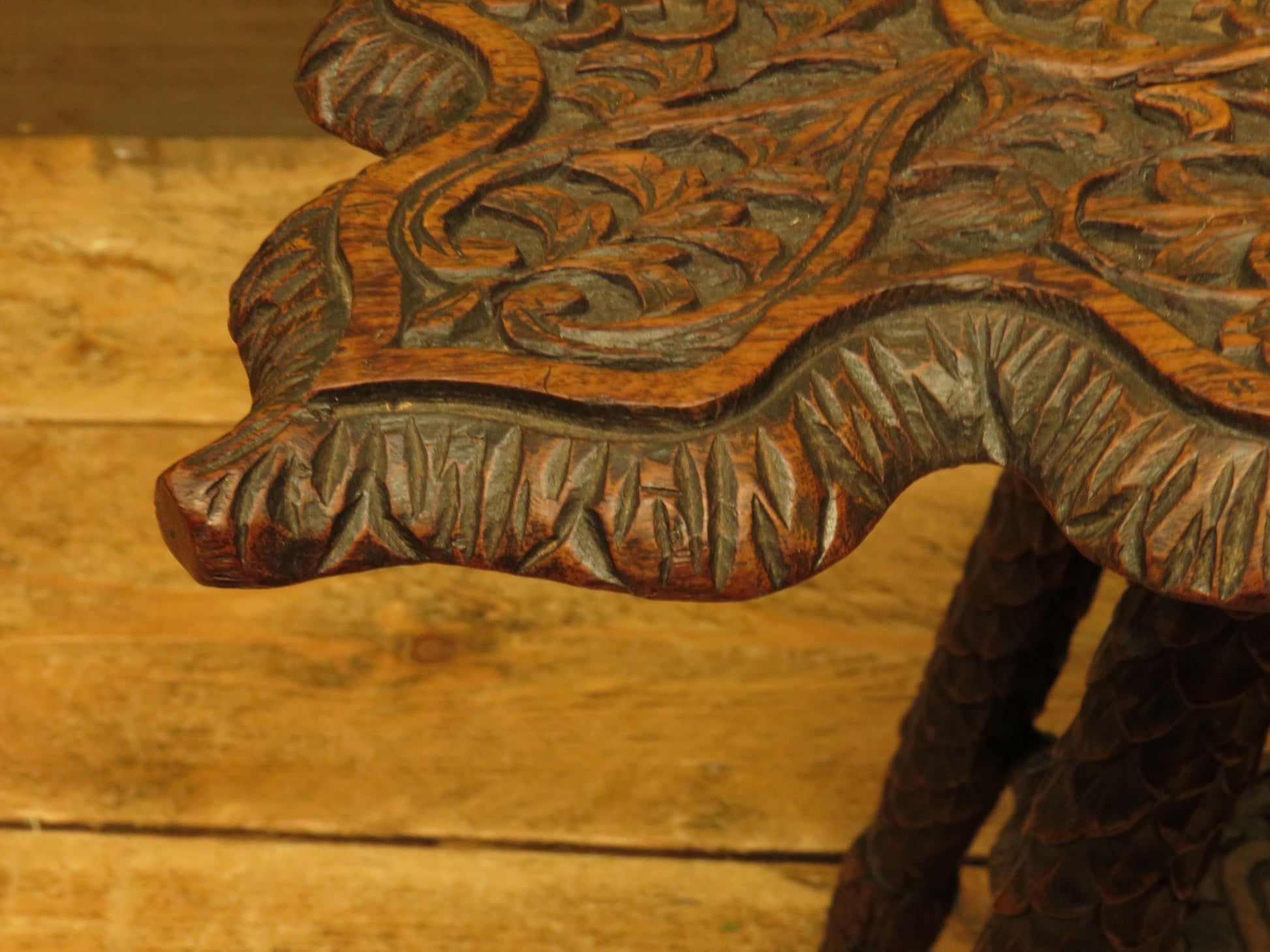 The table has a shaped top and under-tier and is heavily carved, the top is set on slanted legs which are carved to resemble scales.