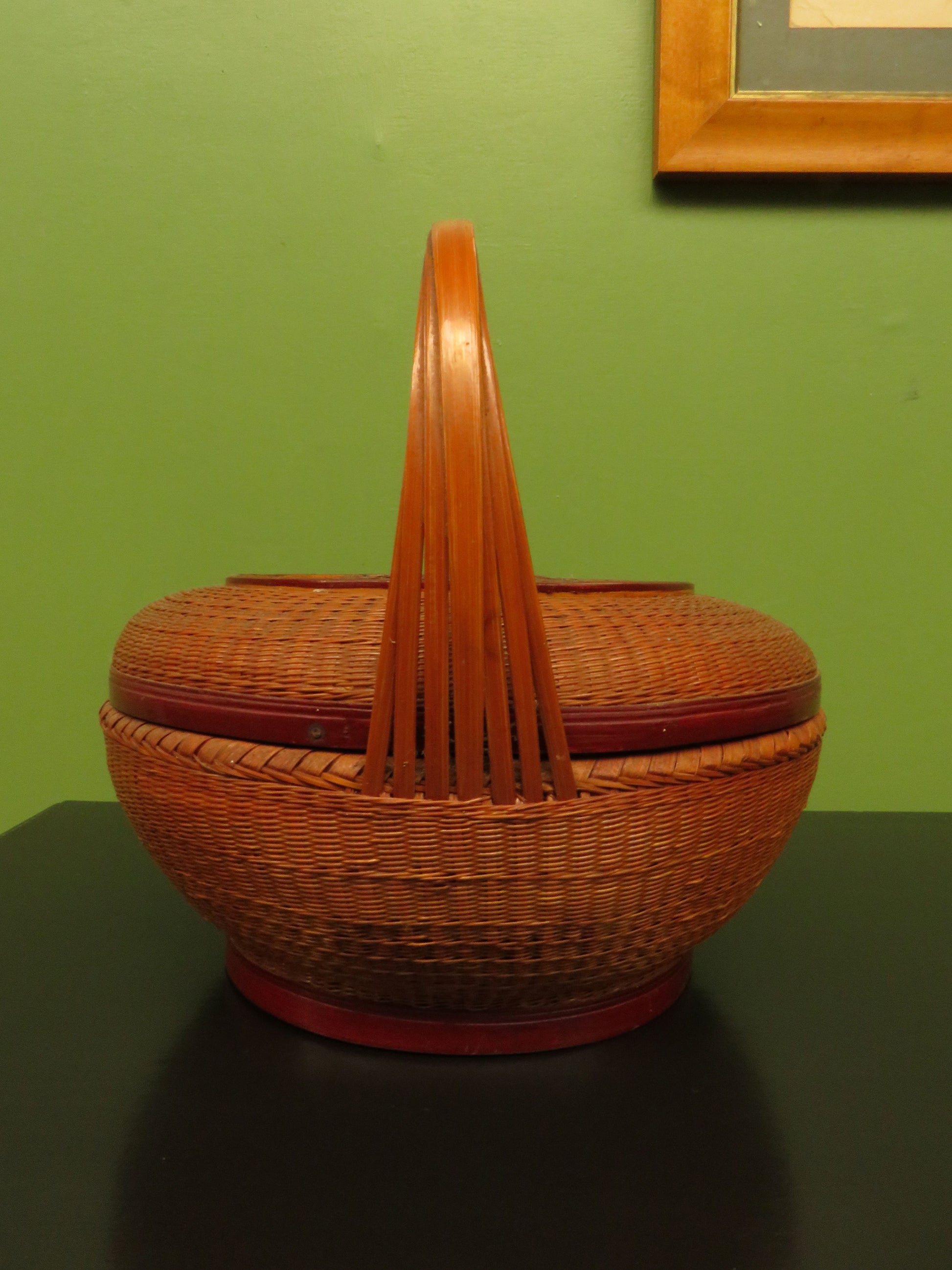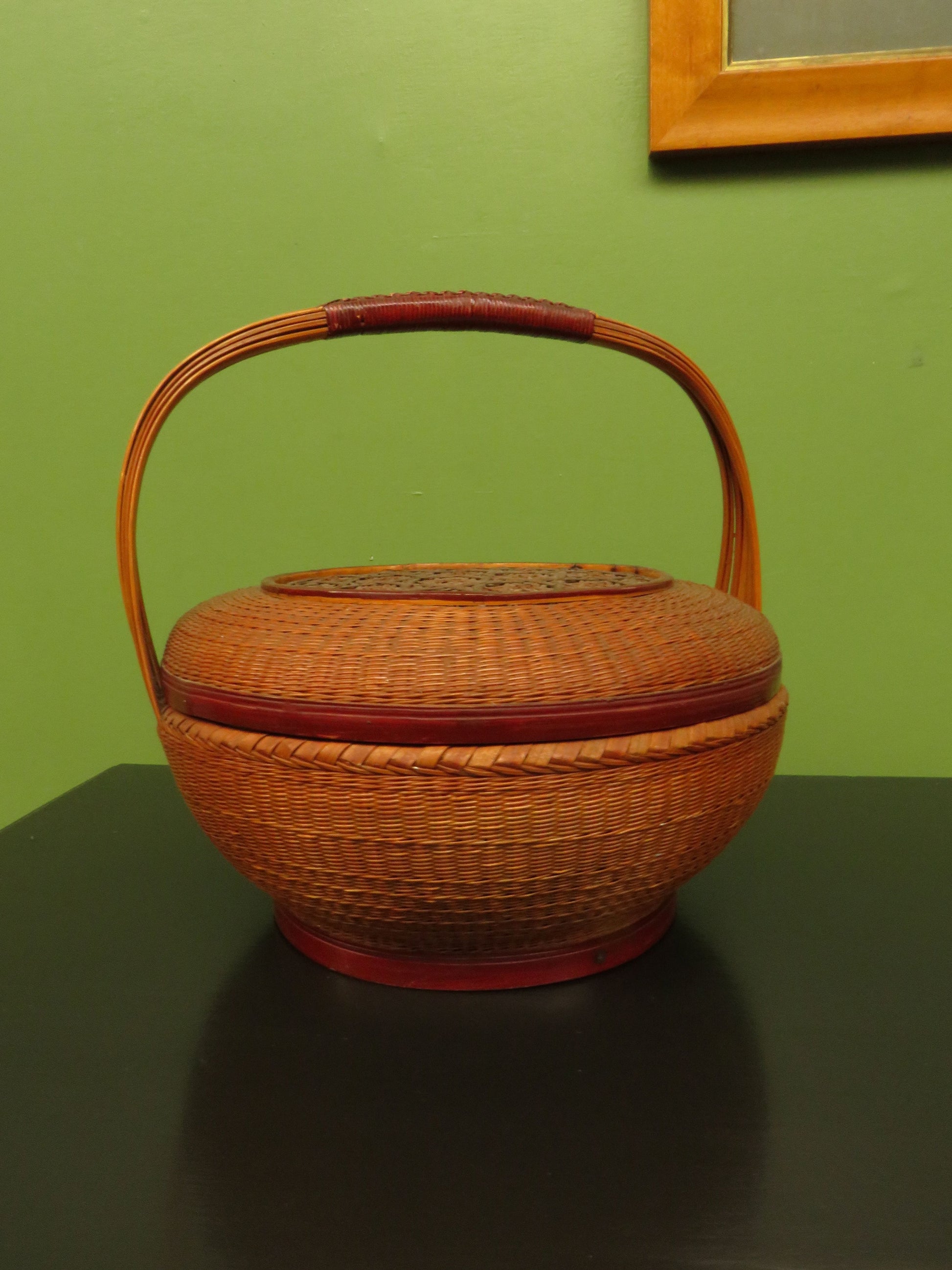 It is a good example of traditional Chinese craftsmanship and is made of split lacquered bamboo with a curved handle and woven lid.