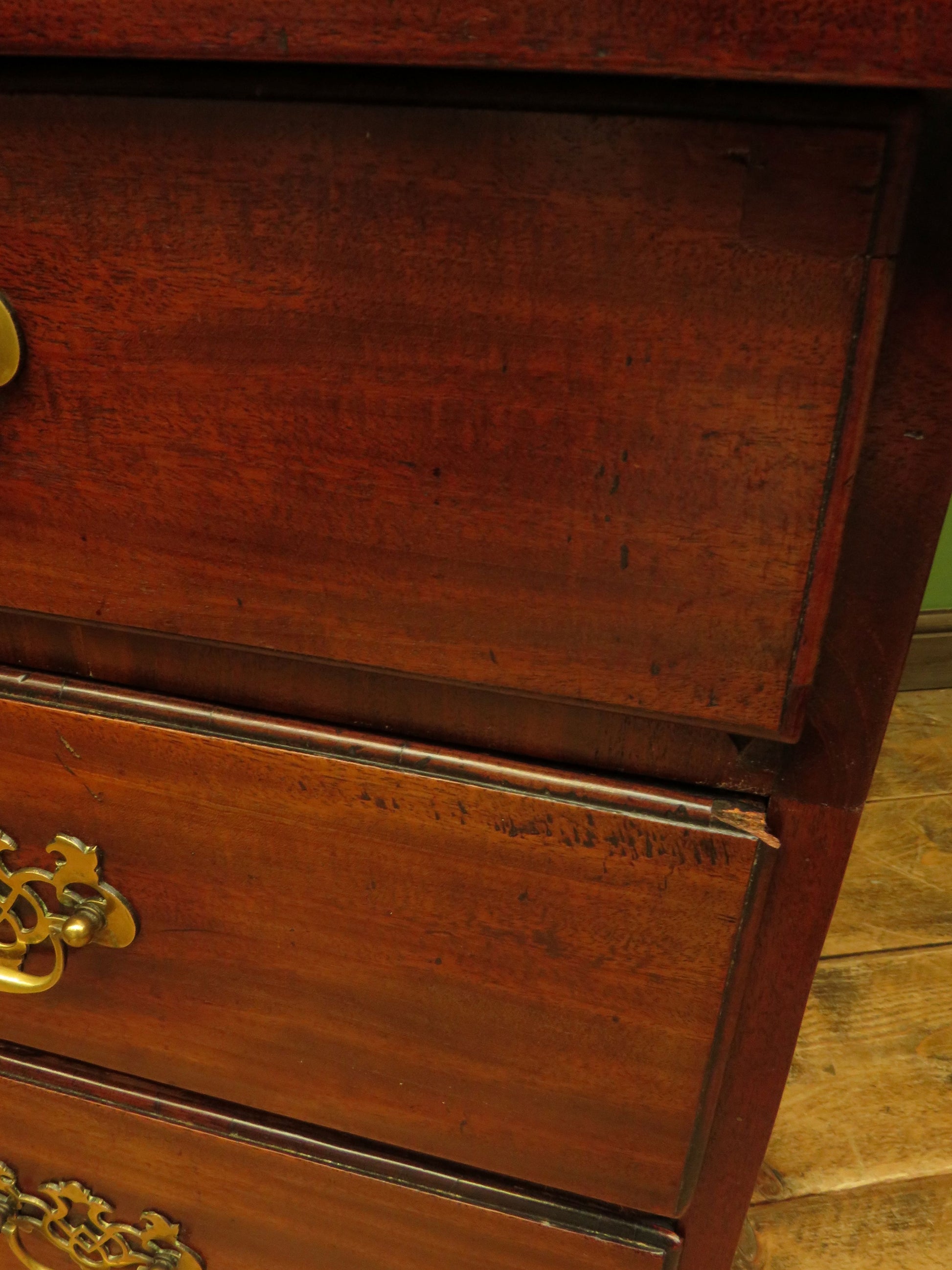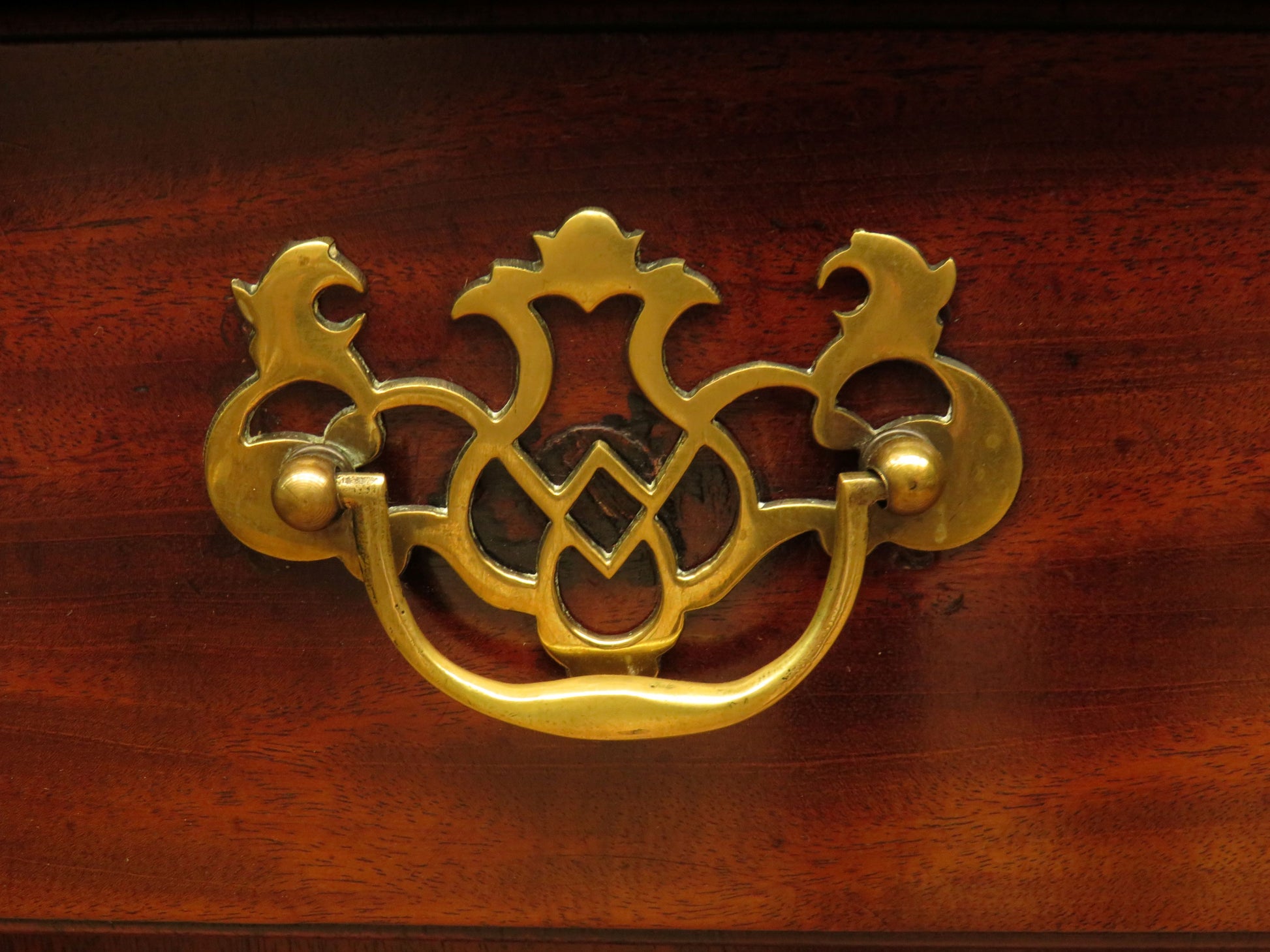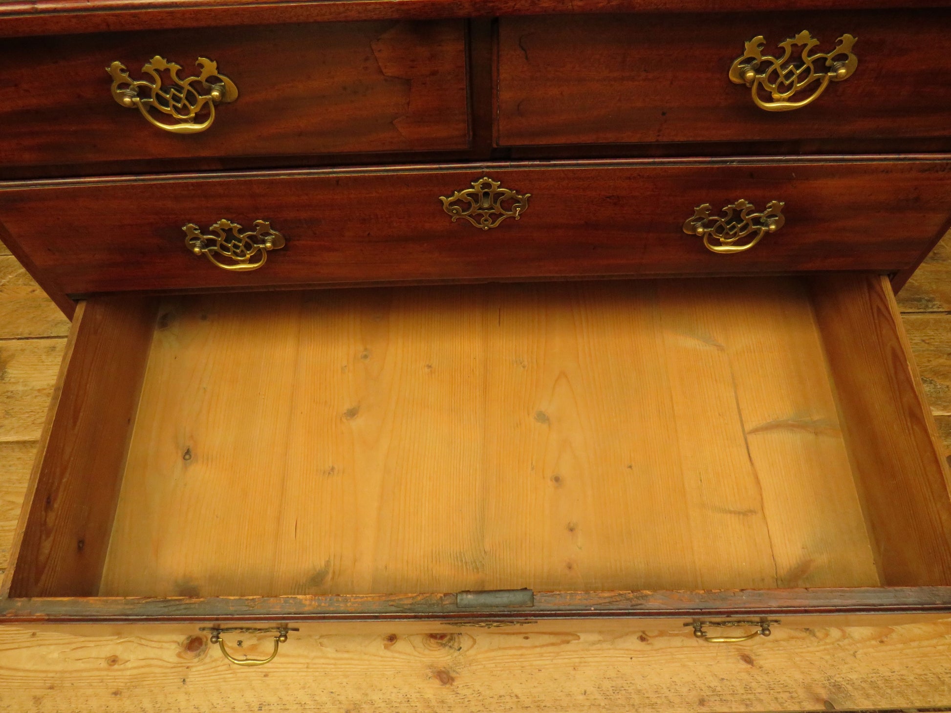 The front of the chest is fitted with five drawers which are finished with decorative brass drop handles and escutcheons. The drawers run well and the interiors are in clean condition.