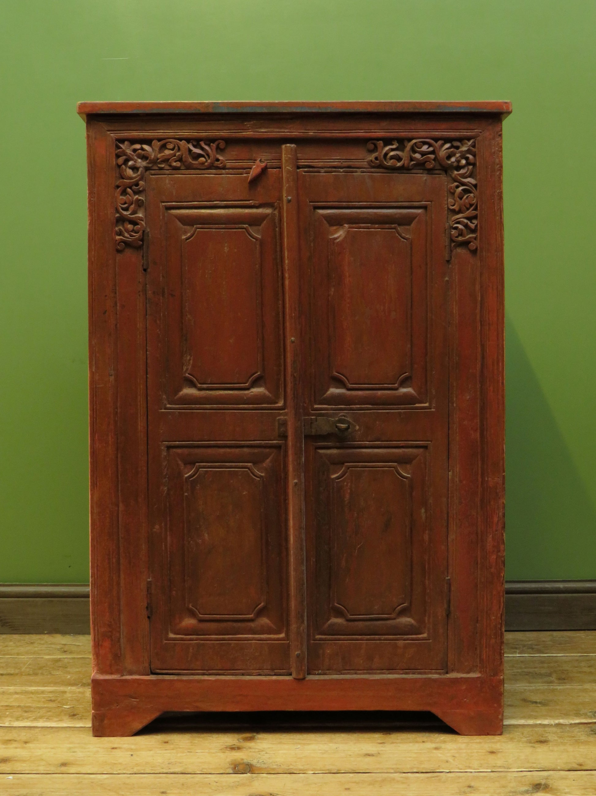 The cupboard is set on a simple shaped base plinth and the cupboard retains it original red painted finish to the front and pale pink painted finish to the sides.