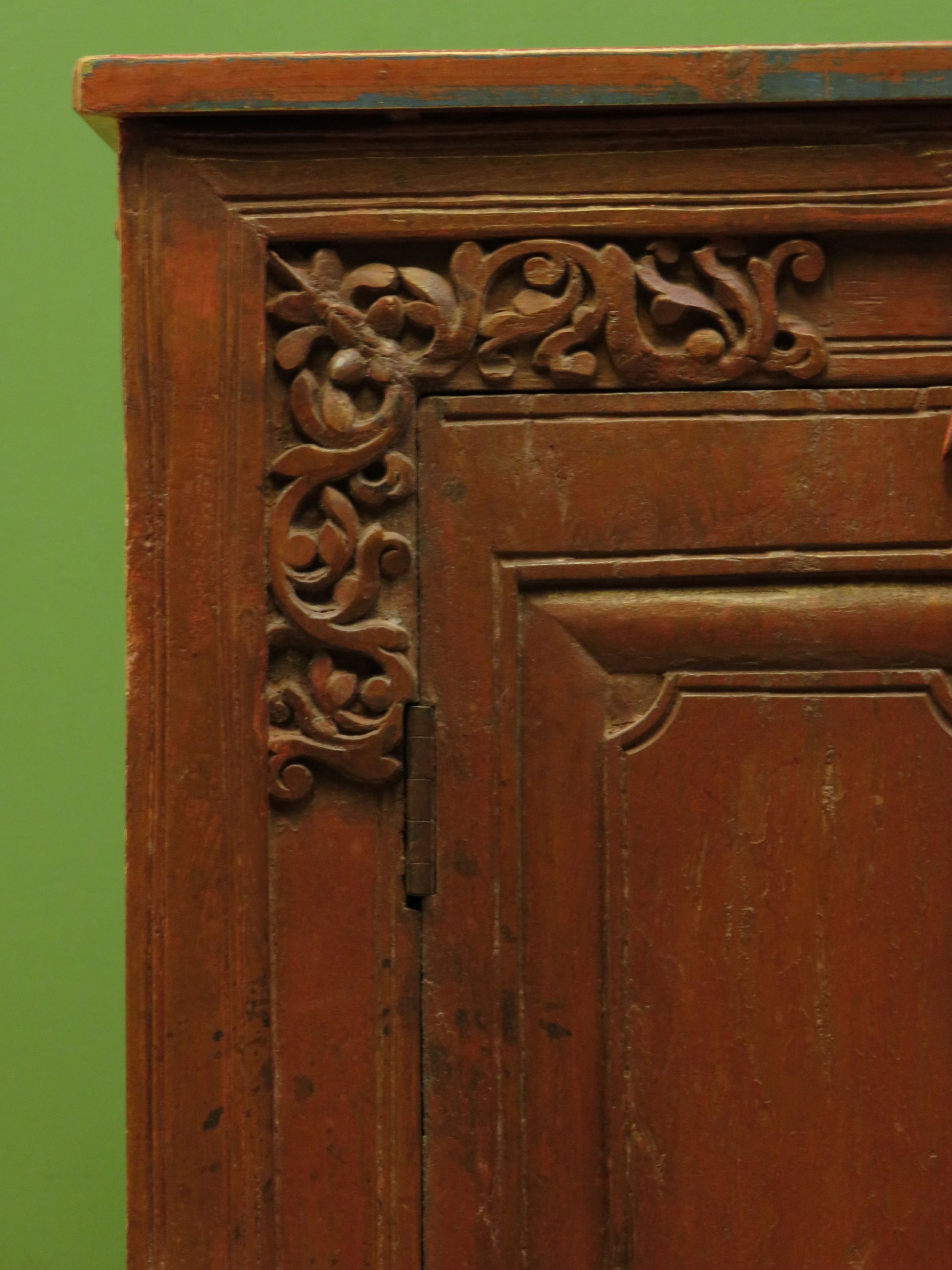 The cupboard front has two panelled doors which feature intricate carvings to the top corners and a wooden toggle and latch to the hold the doors closed. The doors open to reveal two fixed shelves set below an ornate top shelf surmounted with decorative arcading.