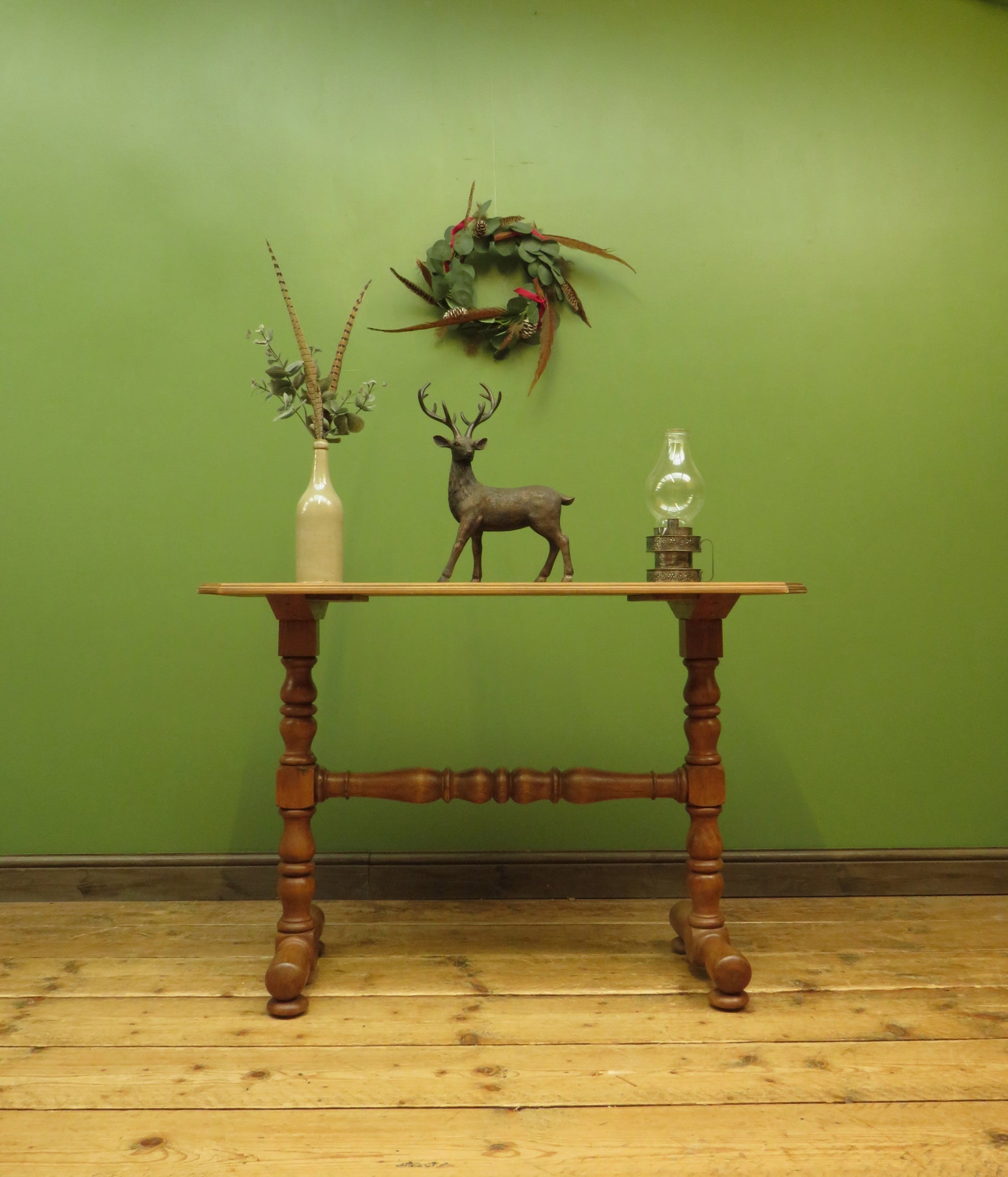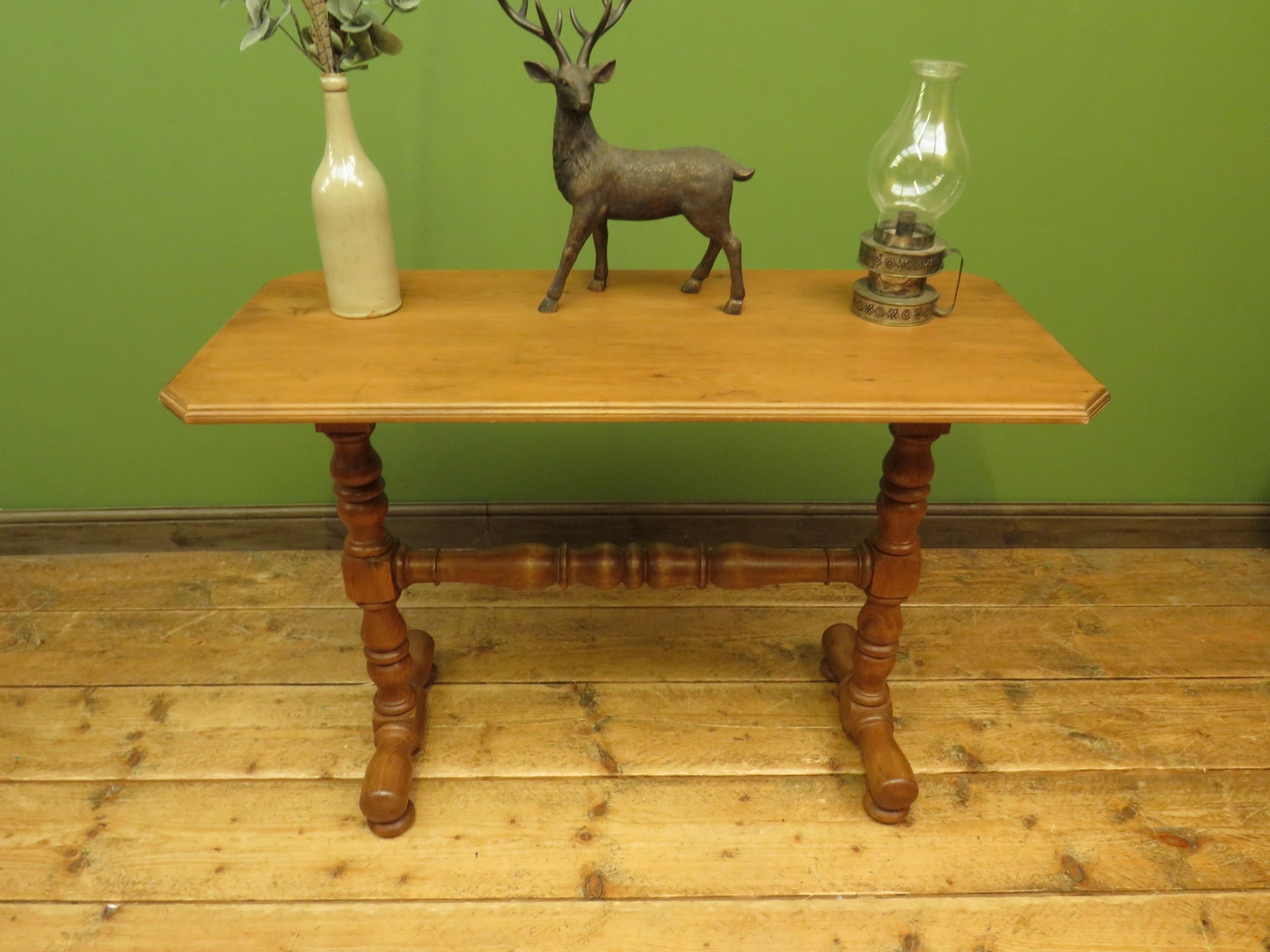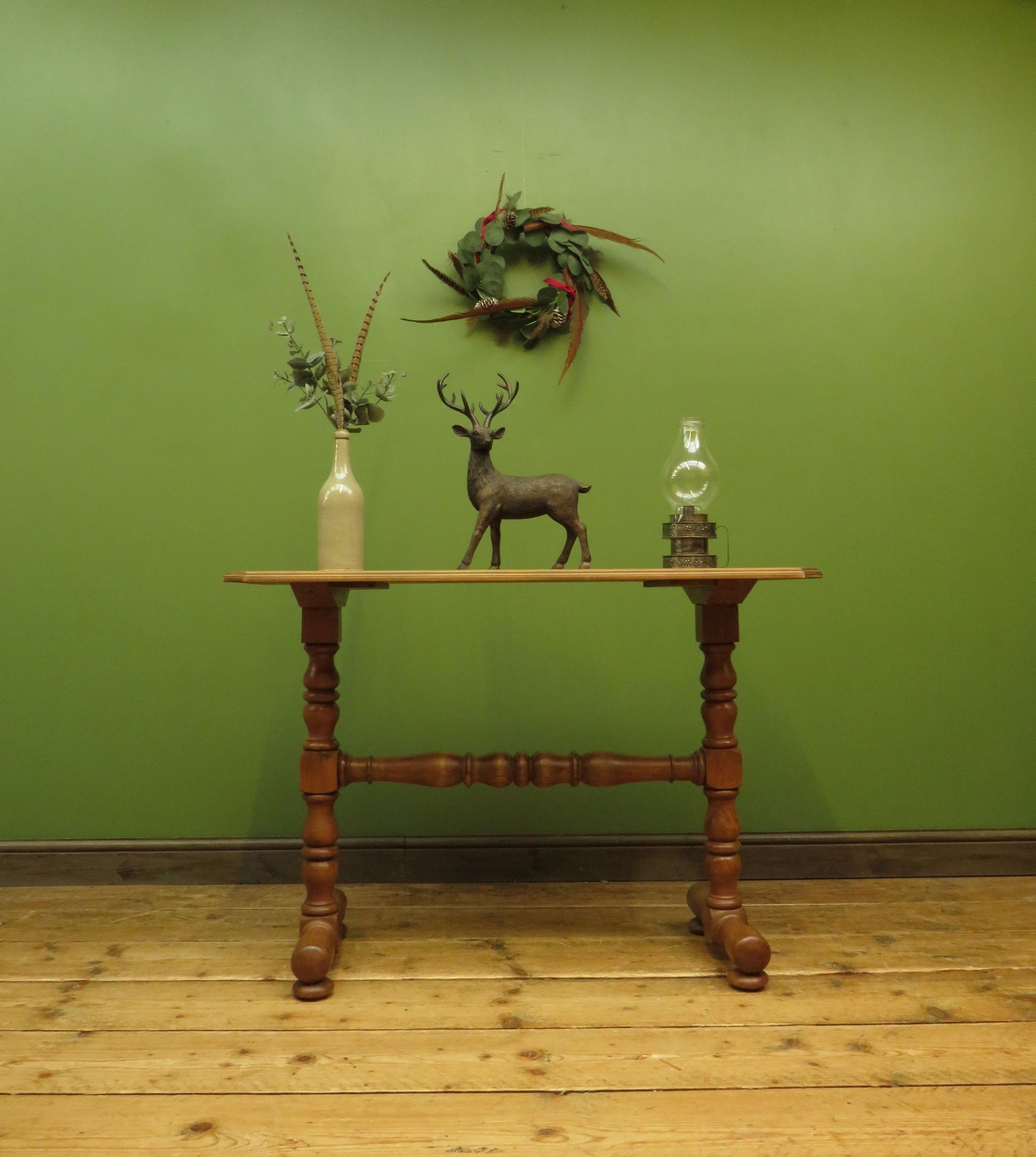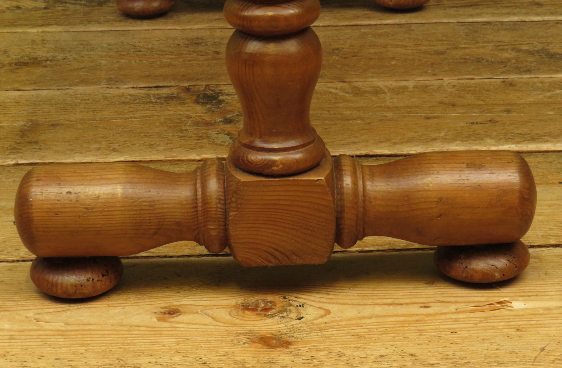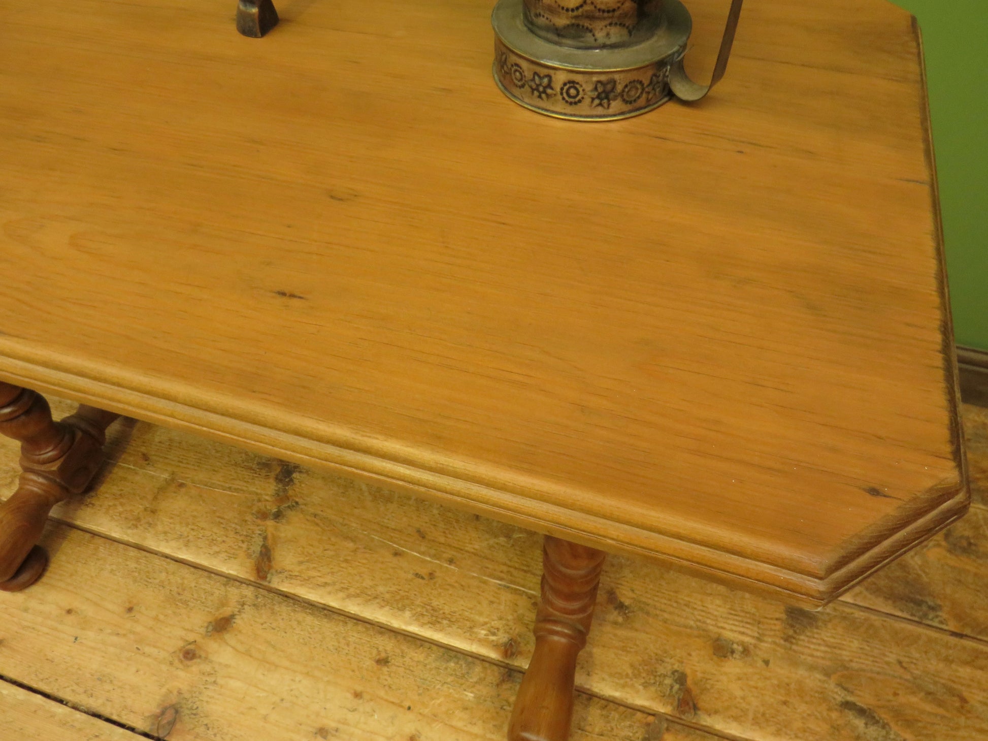 Made of solid pine the table is set on a turned base which has a horizontal stretcher and a lovely waxed finish. The table top has canted corners and a natural looking unwaxed finish with some minor marks of age which give it character.