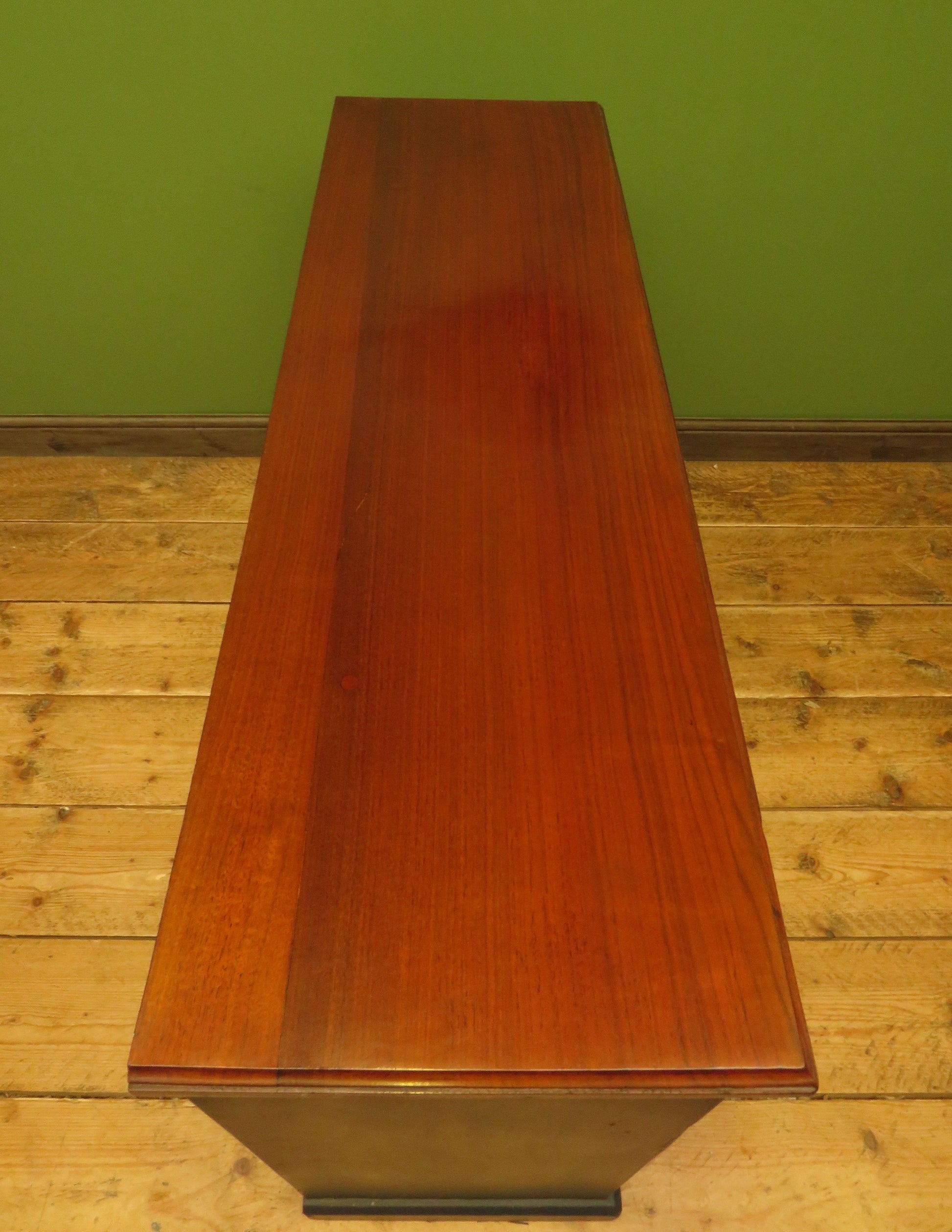 The sideboard has been hand painted in black water based furniture paint before being lightly distressed and then waxed for protection. The top of the sideboard has been stripped and newly French Polished.