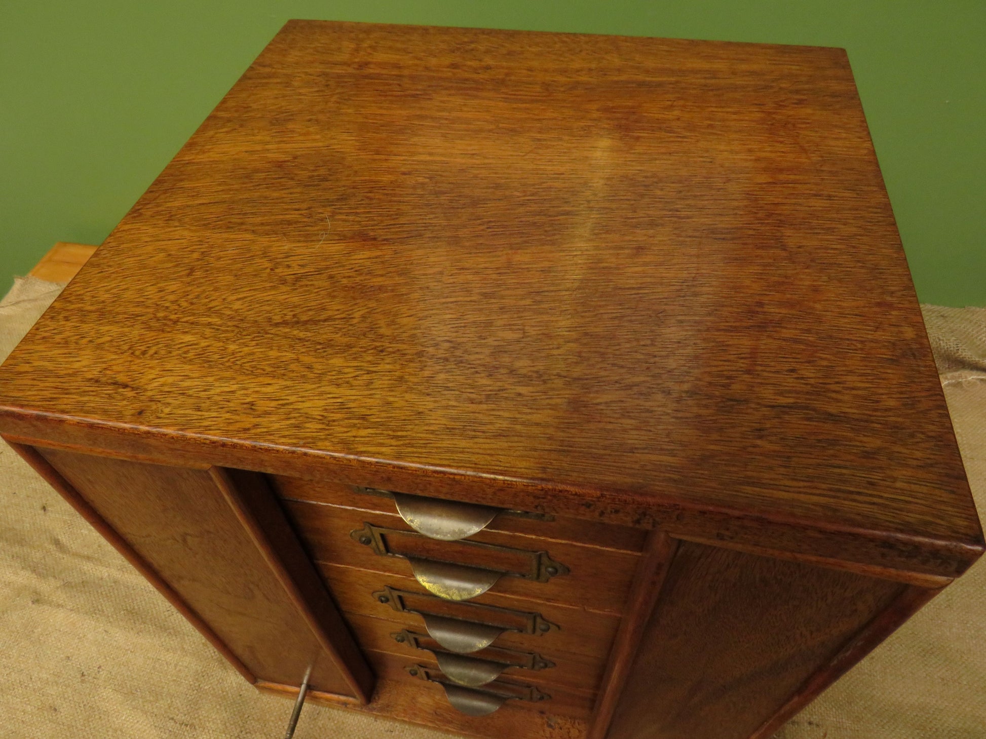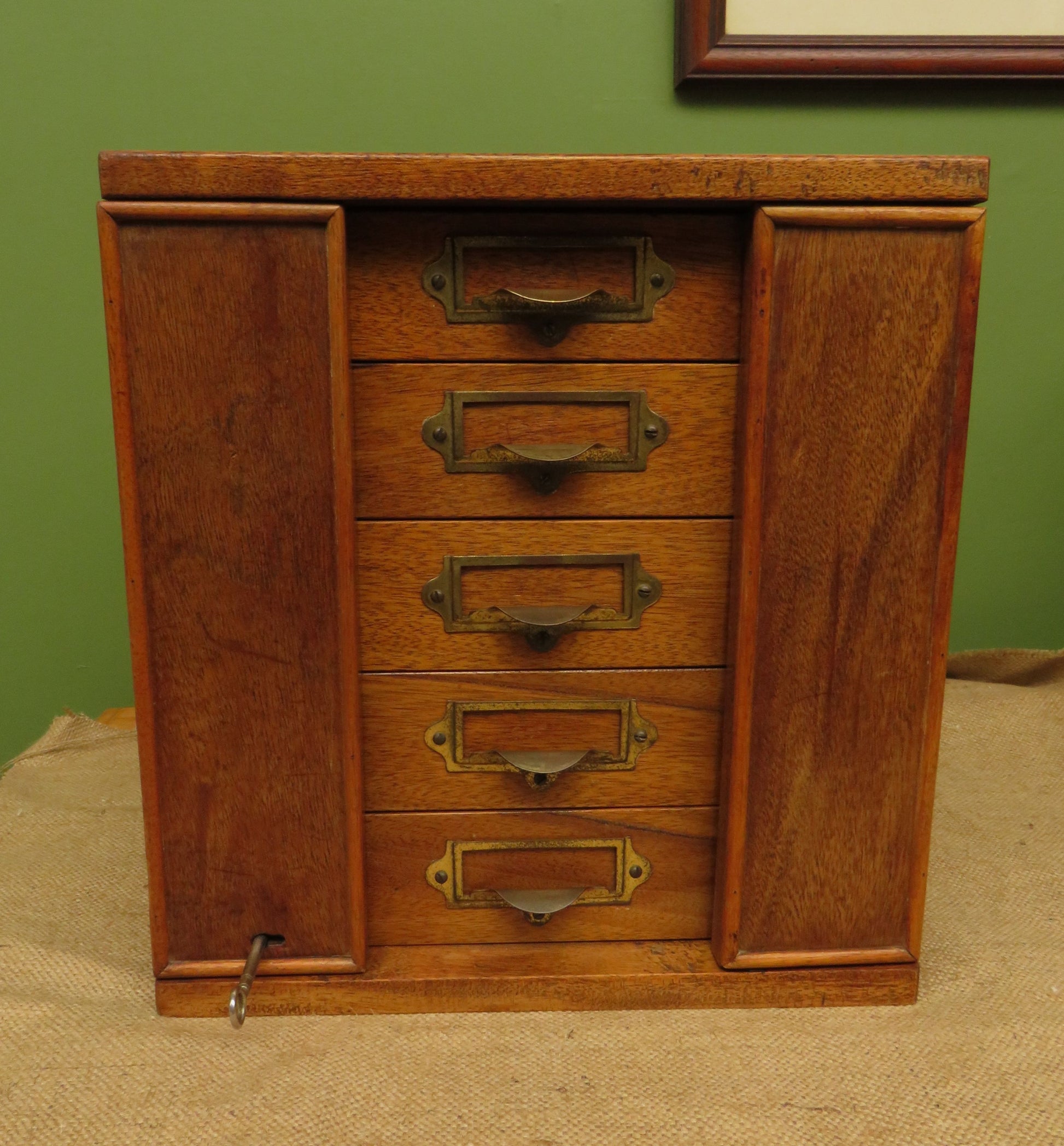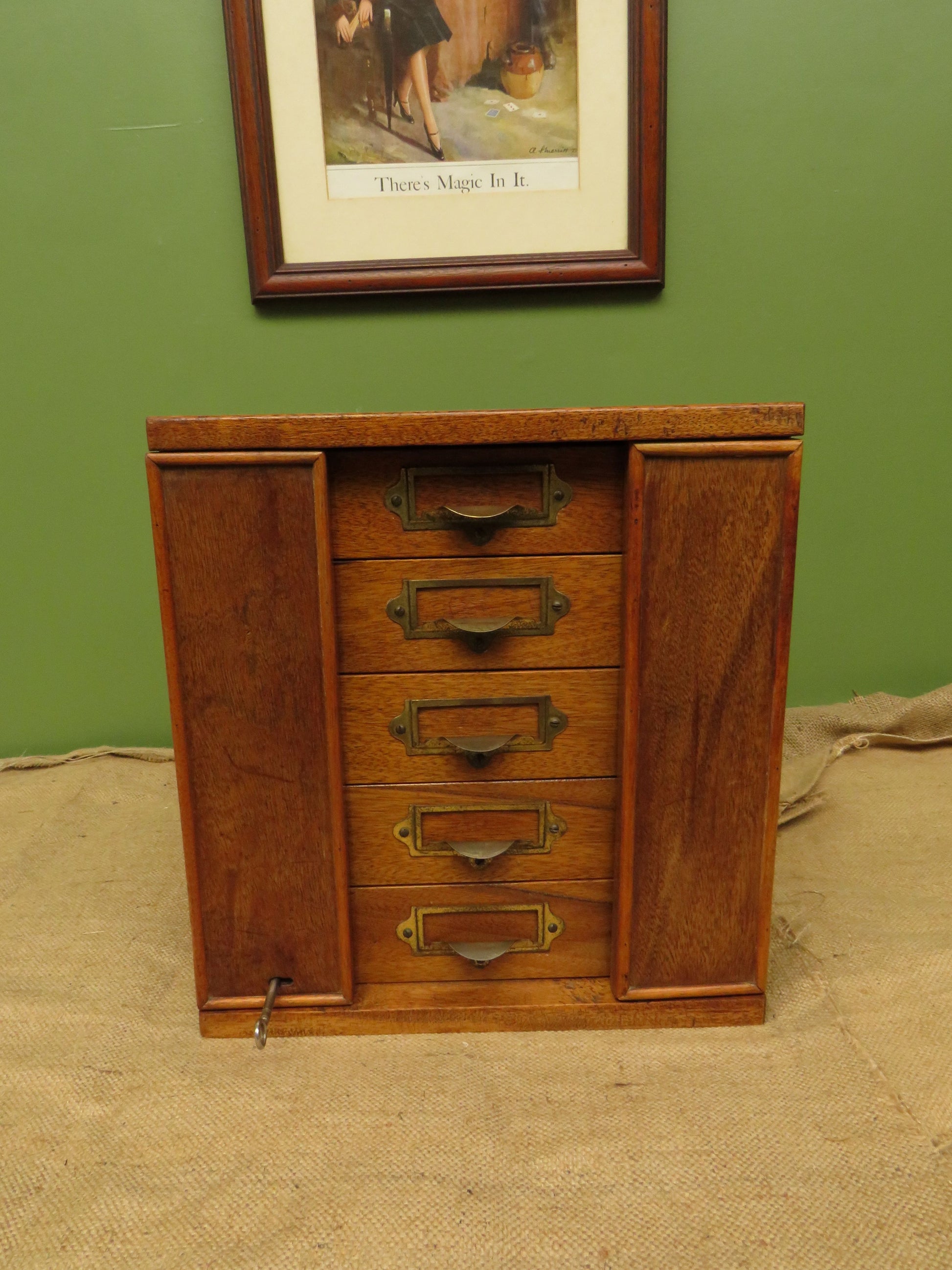 Originally designed as a collectors chest or possibly for filing paperwork this small chest is ideal for use in an office or workshop. Made of mixed woods and plywood it is fairly compact and is perfect for use on the top of a desk or table.