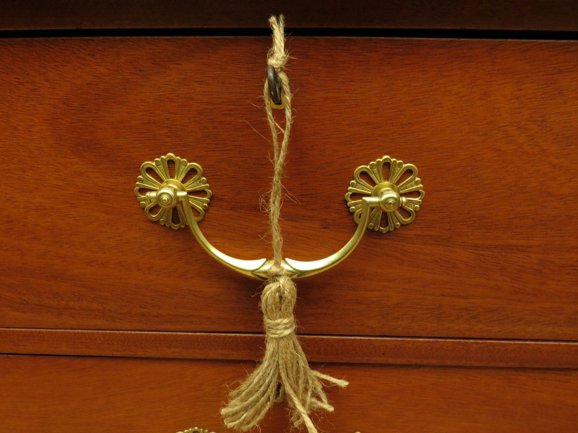 The chest is fairly compact, the front fitted with four lockable drawers which are finished with attractive solid brass handles. The bases of the drawers are made of thick board.