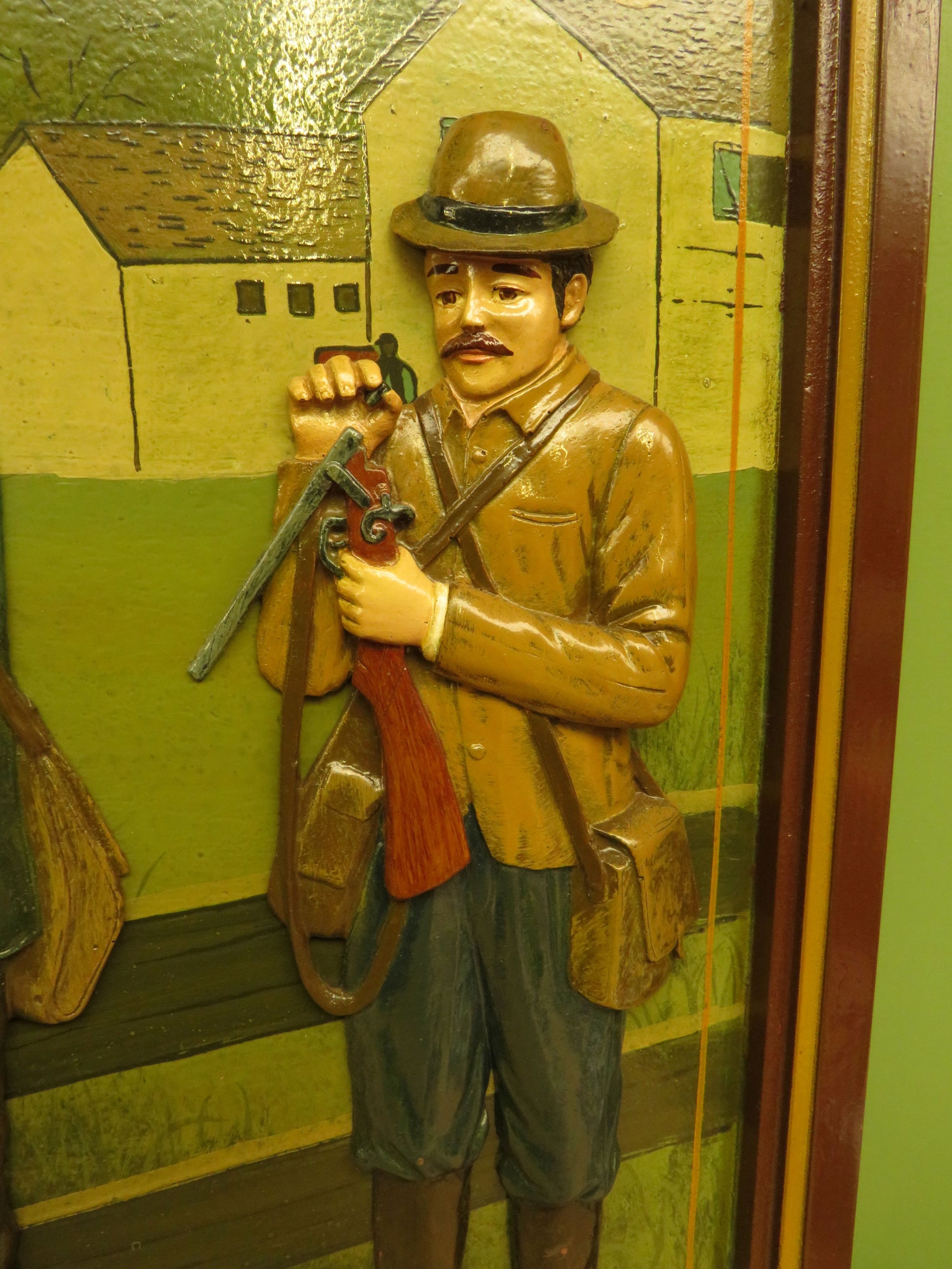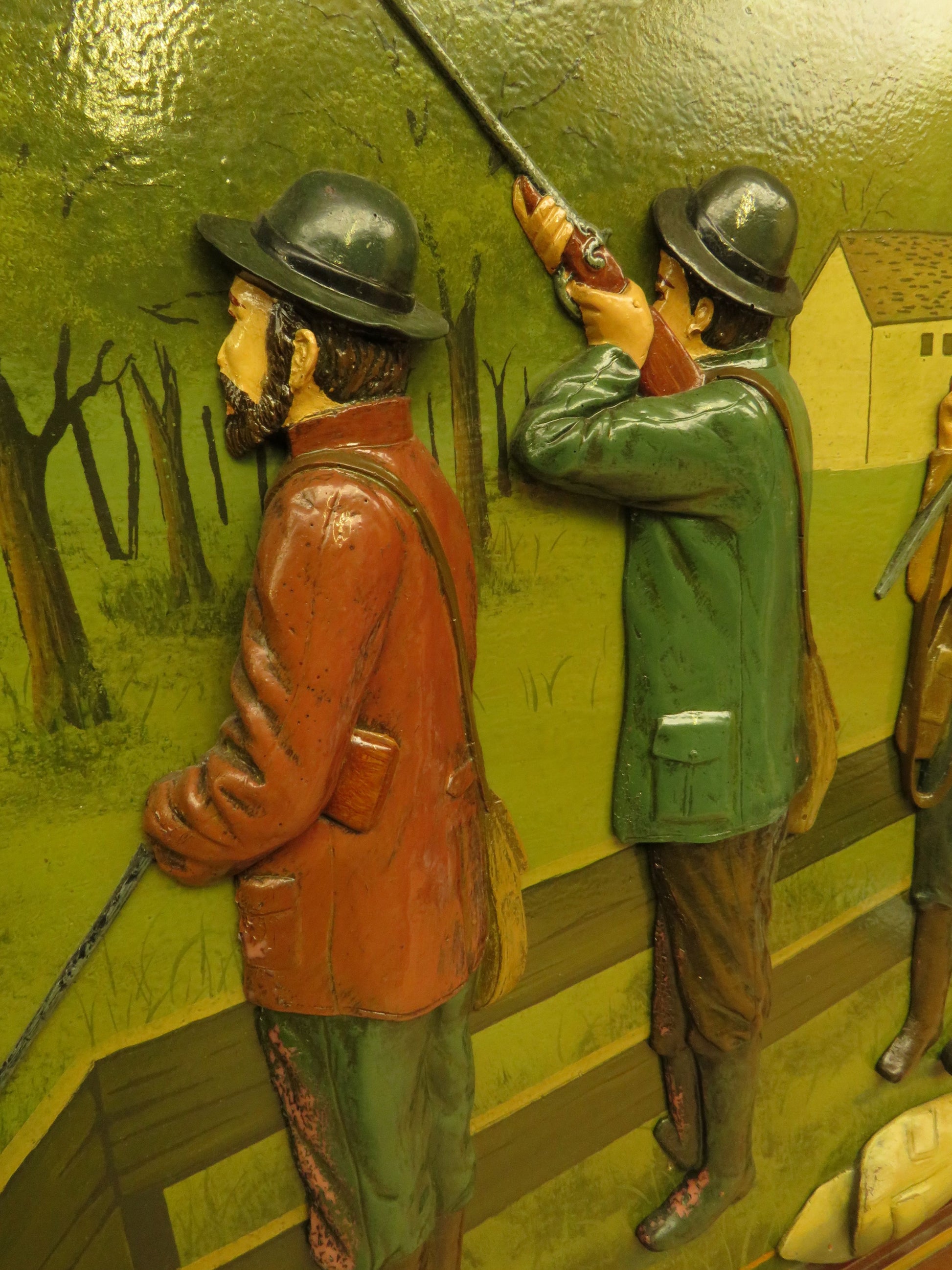 The sign is fairly large and made of solid wood, with hand painted decoration to the front featuring three hunters.