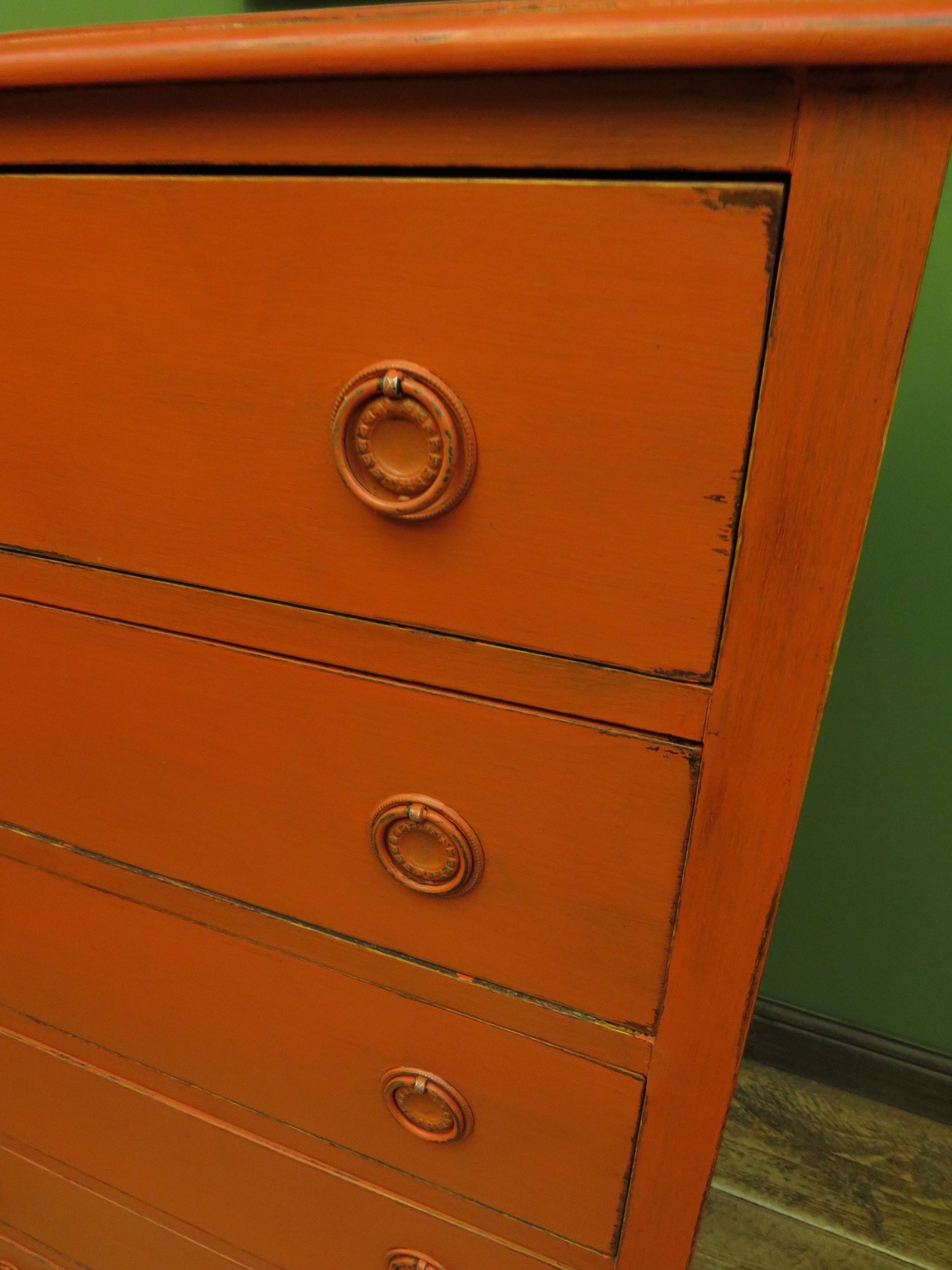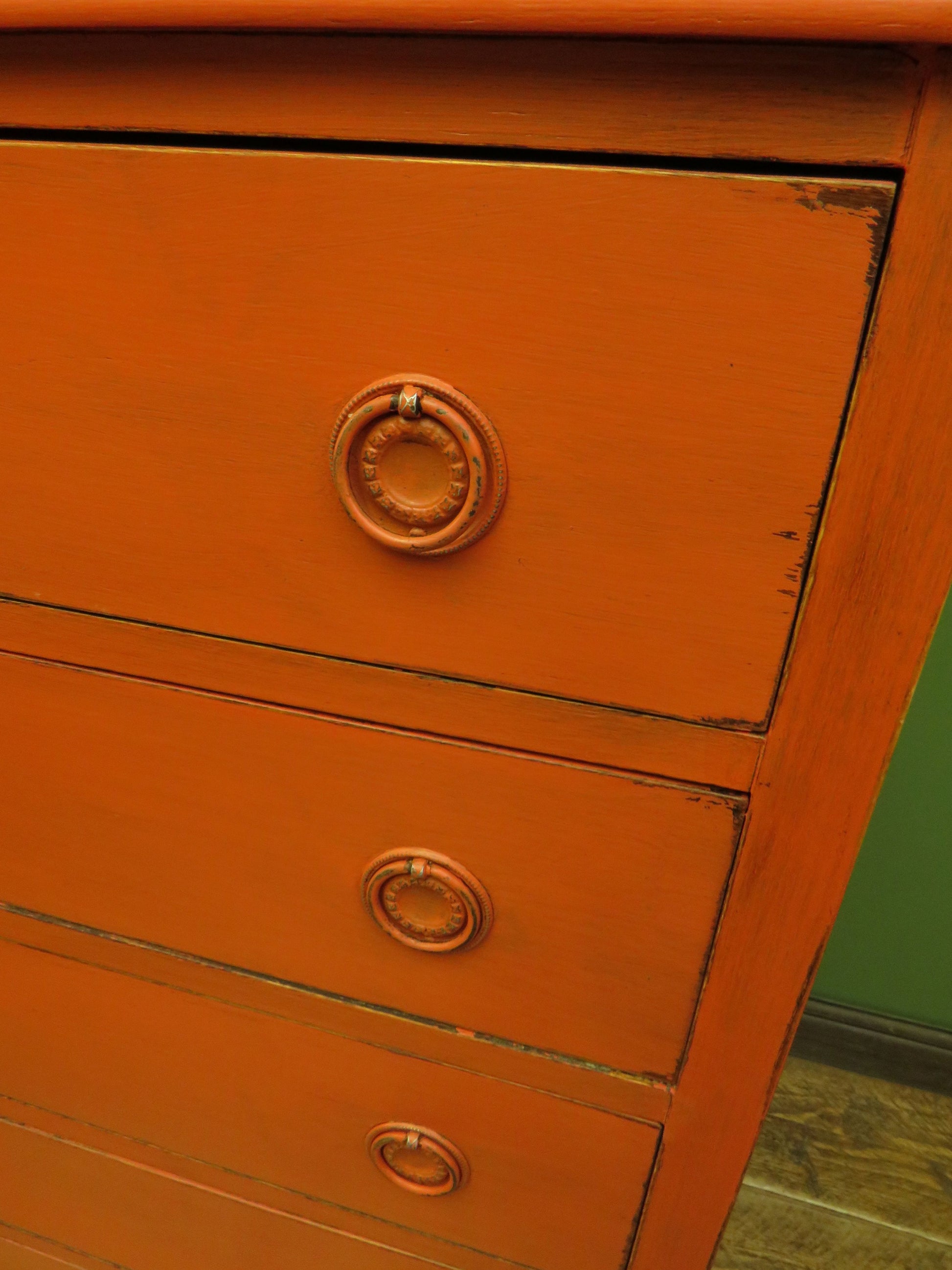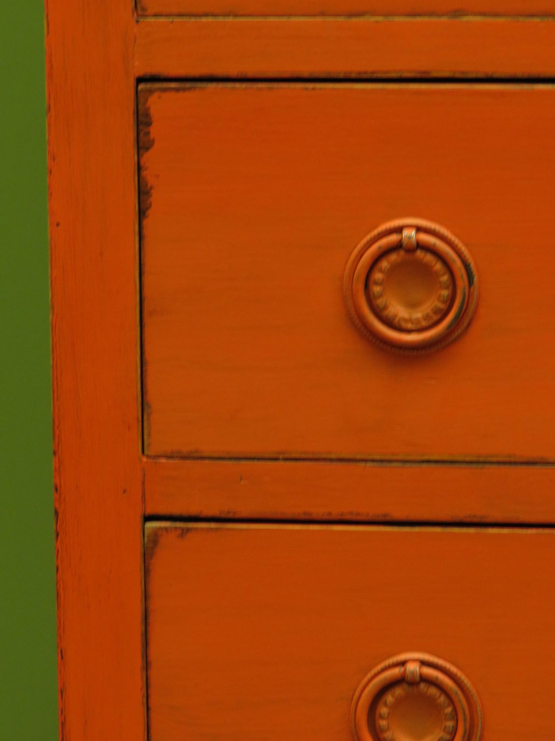 We have hand painted this piece in a lovely orange eggshell paint, the colour is comparable to Little Green's 'Heat'. The finish has been lightly distressed and then darkly waxed to add depth and character.