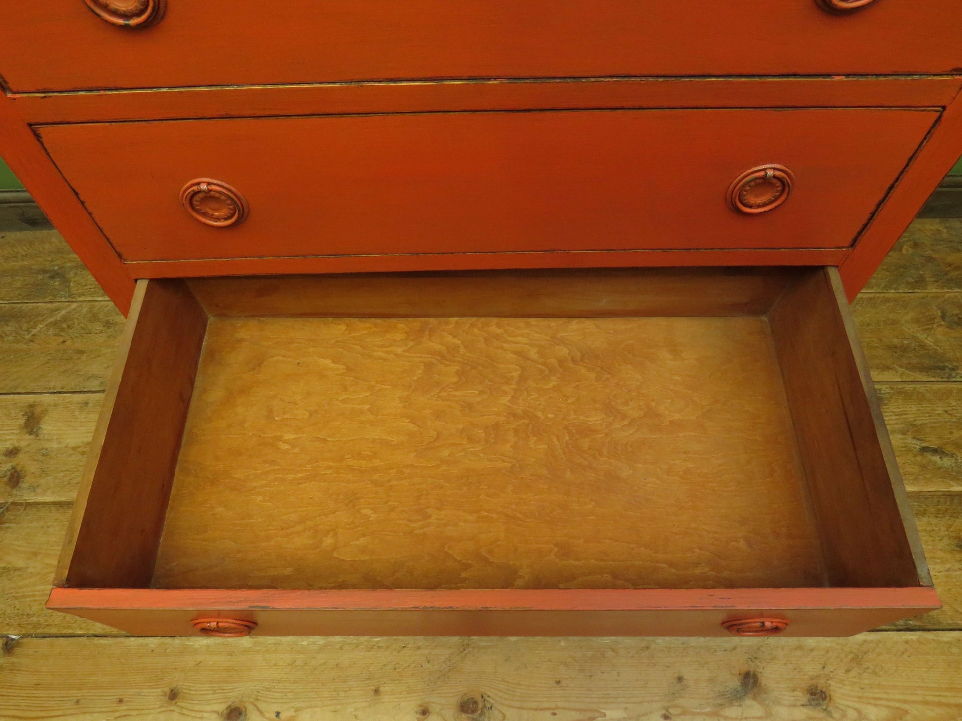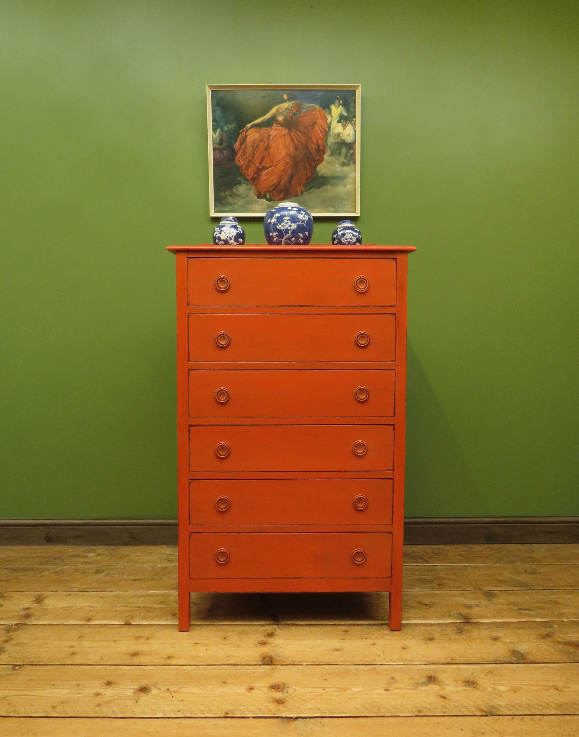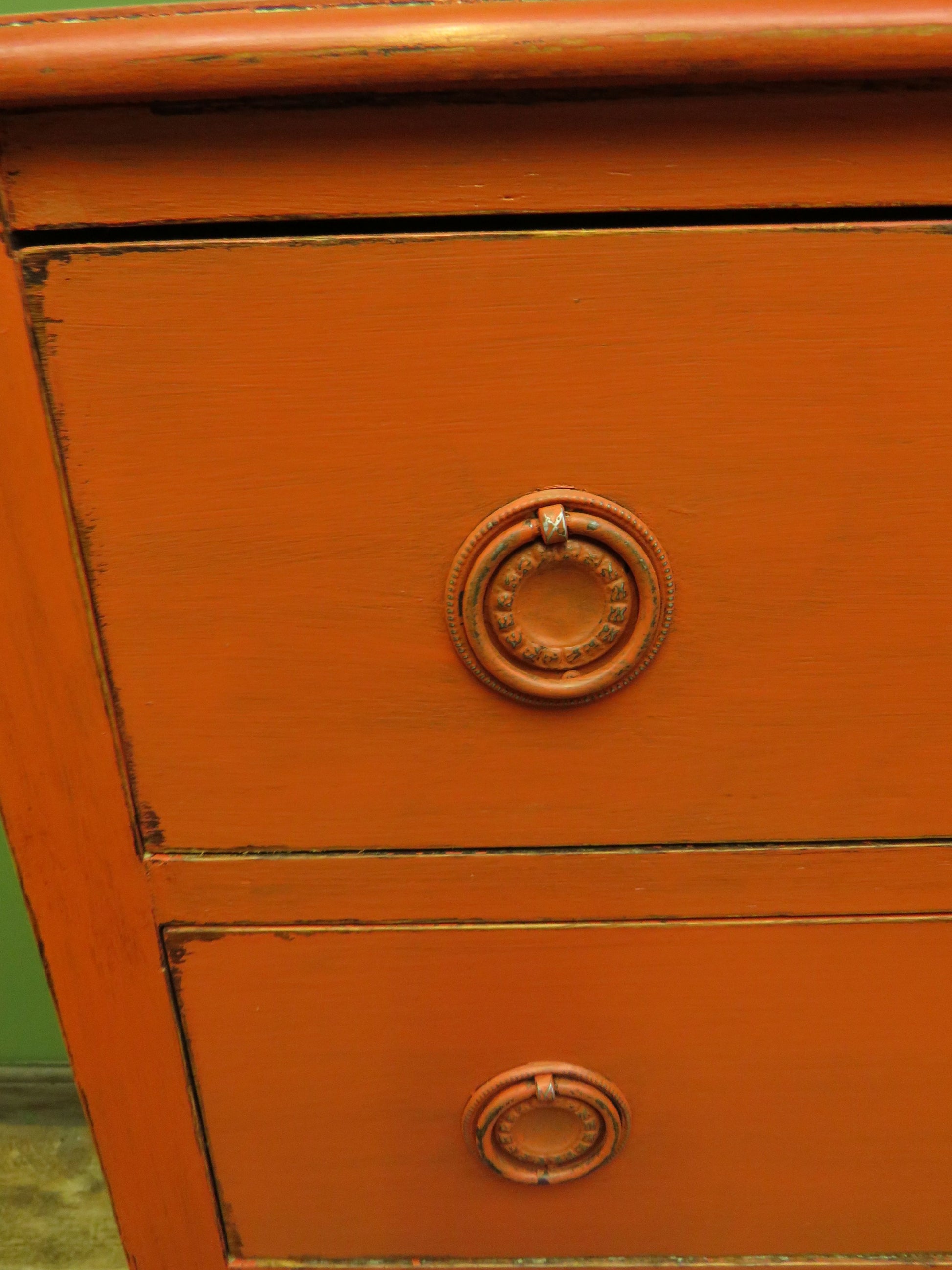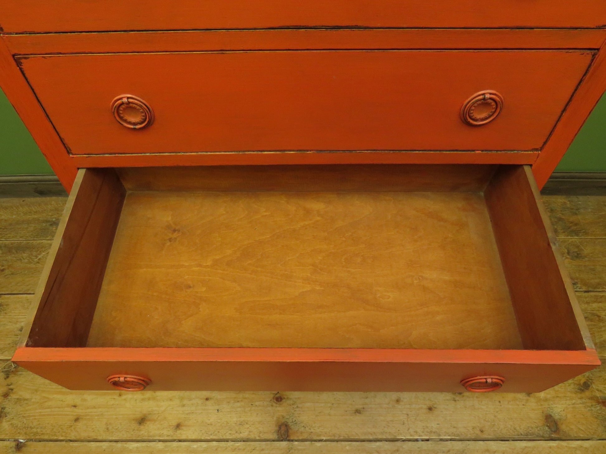 We have hand painted this piece in a lovely orange eggshell paint, the colour is comparable to Little Green's 'Heat'. The finish has been lightly distressed and then darkly waxed to add depth and character.