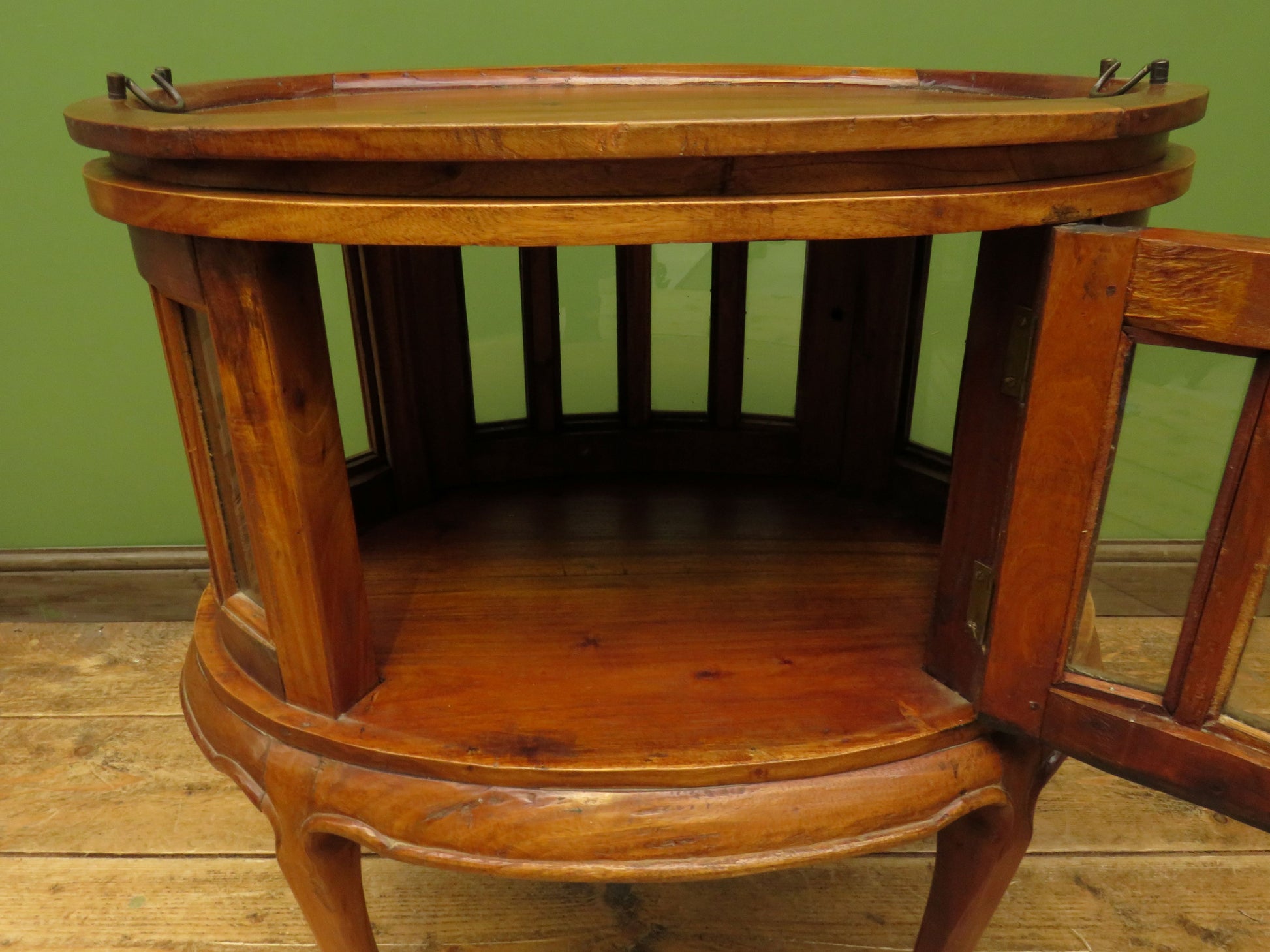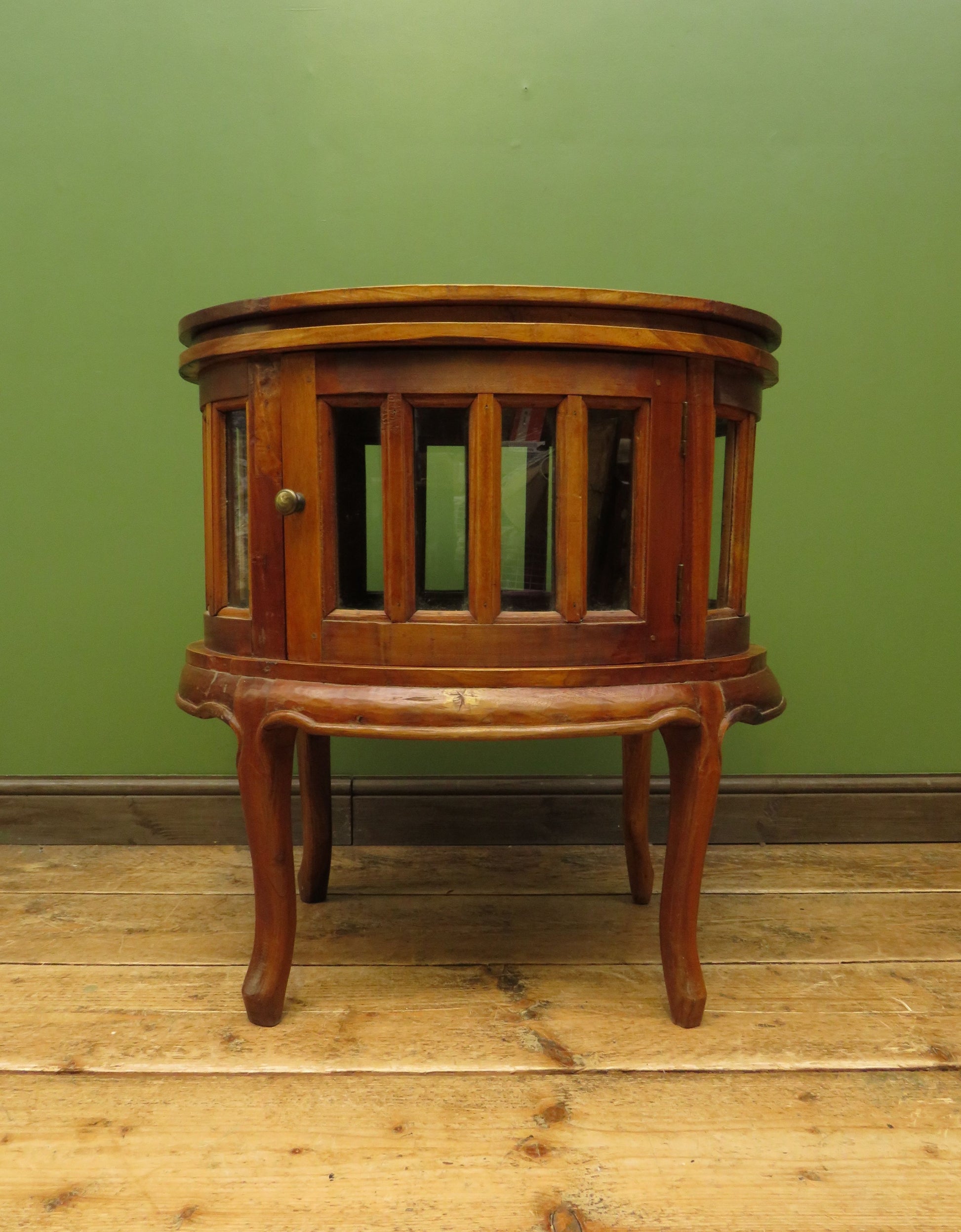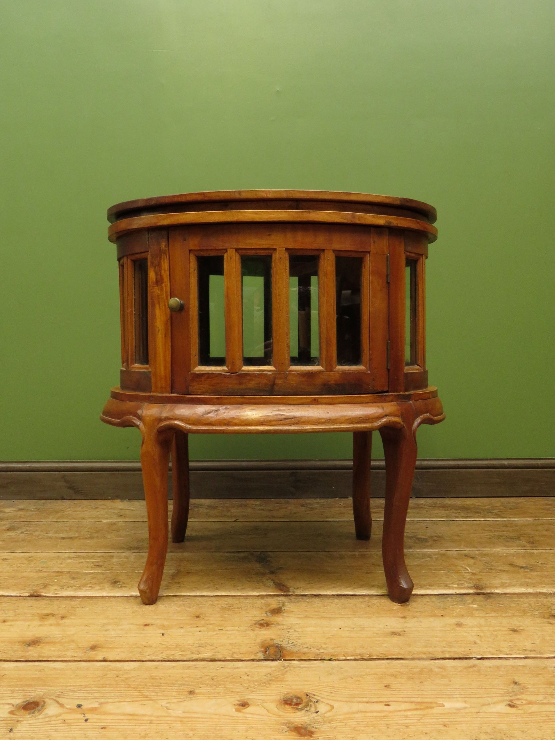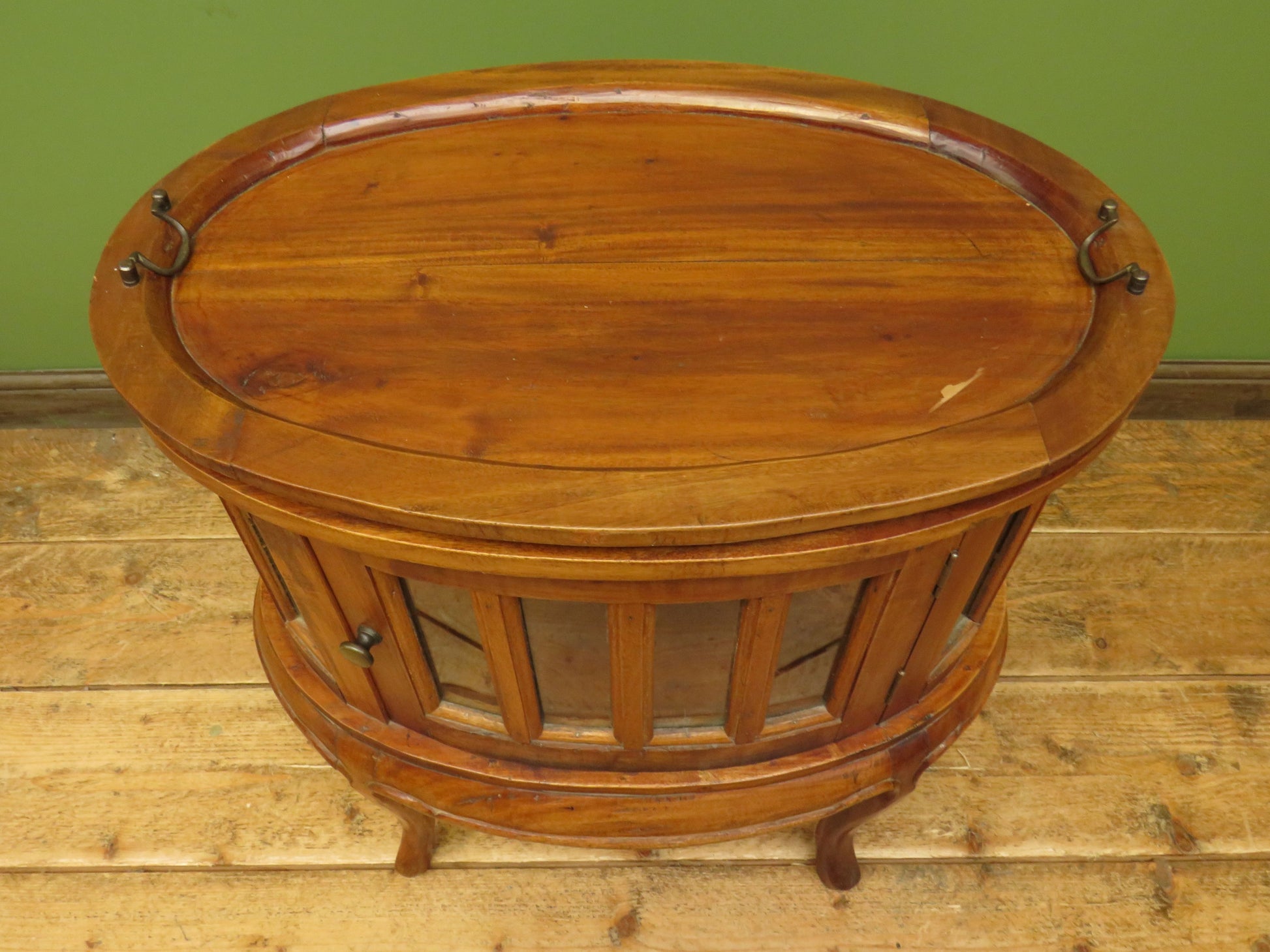The cabinet is oval in shape and has two opposing glazed doors and glazed side panels creating a vitrine effect. The top is fitted with a lift off drinks tray finished with brass drop handles.