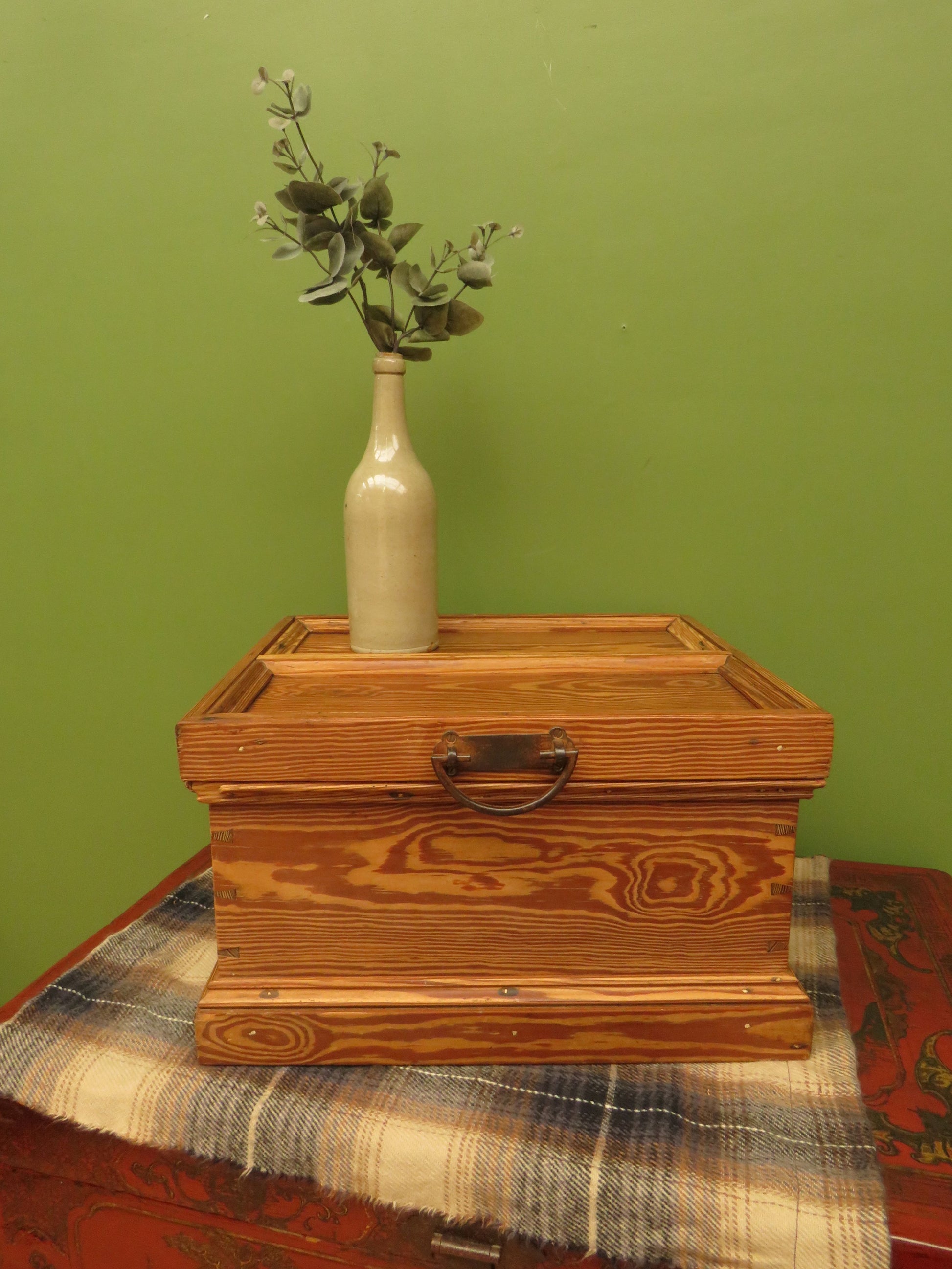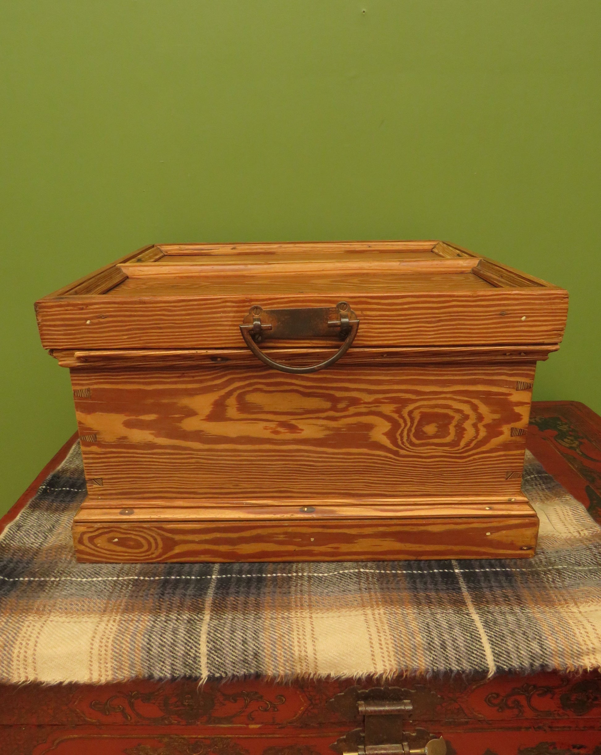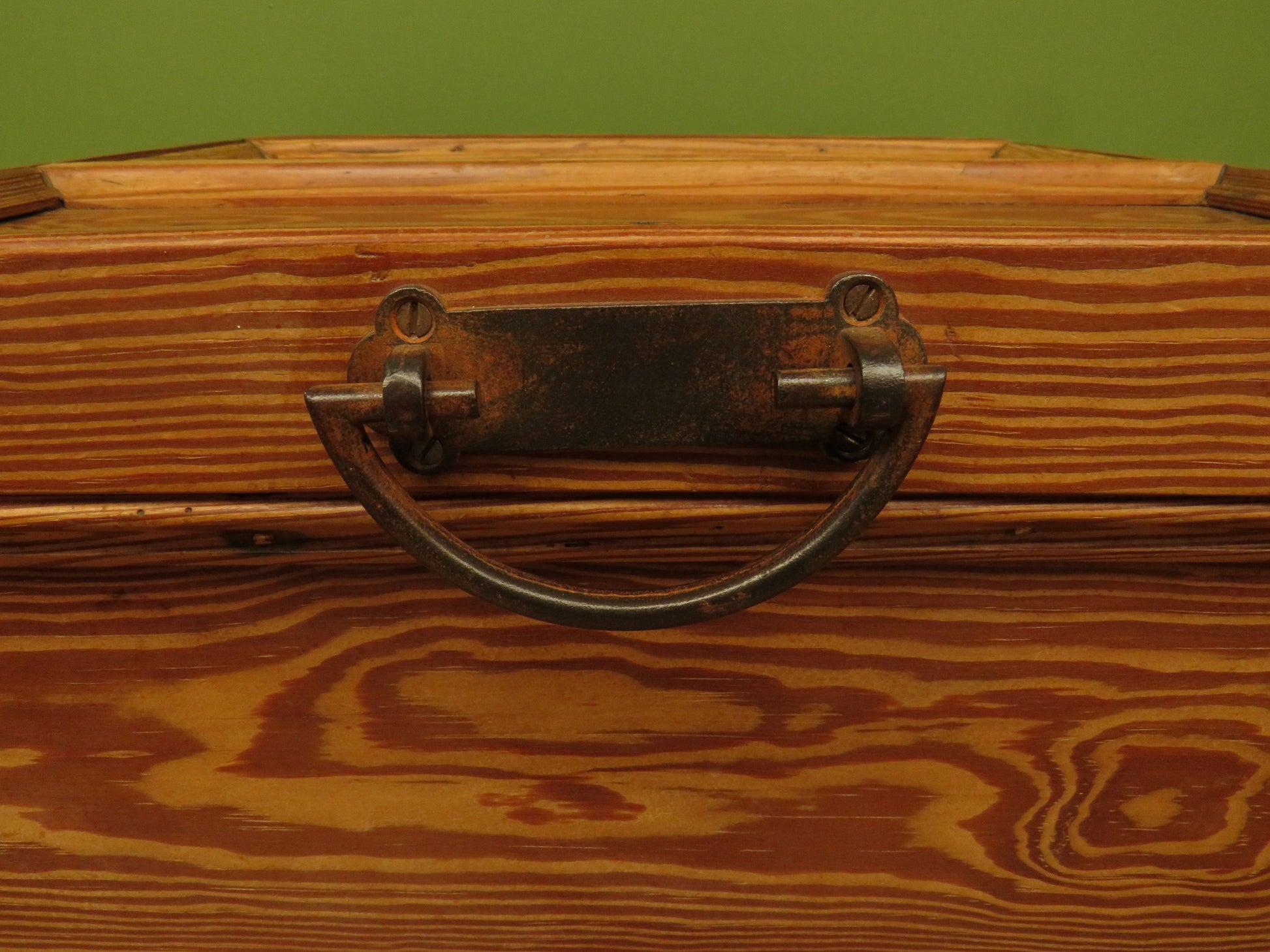 Made of solid pitch pine this piece could serve a variety of uses in any room, perhaps as a tool chest in a workshop or a keepsake box, ideal for stowing away small treasures.