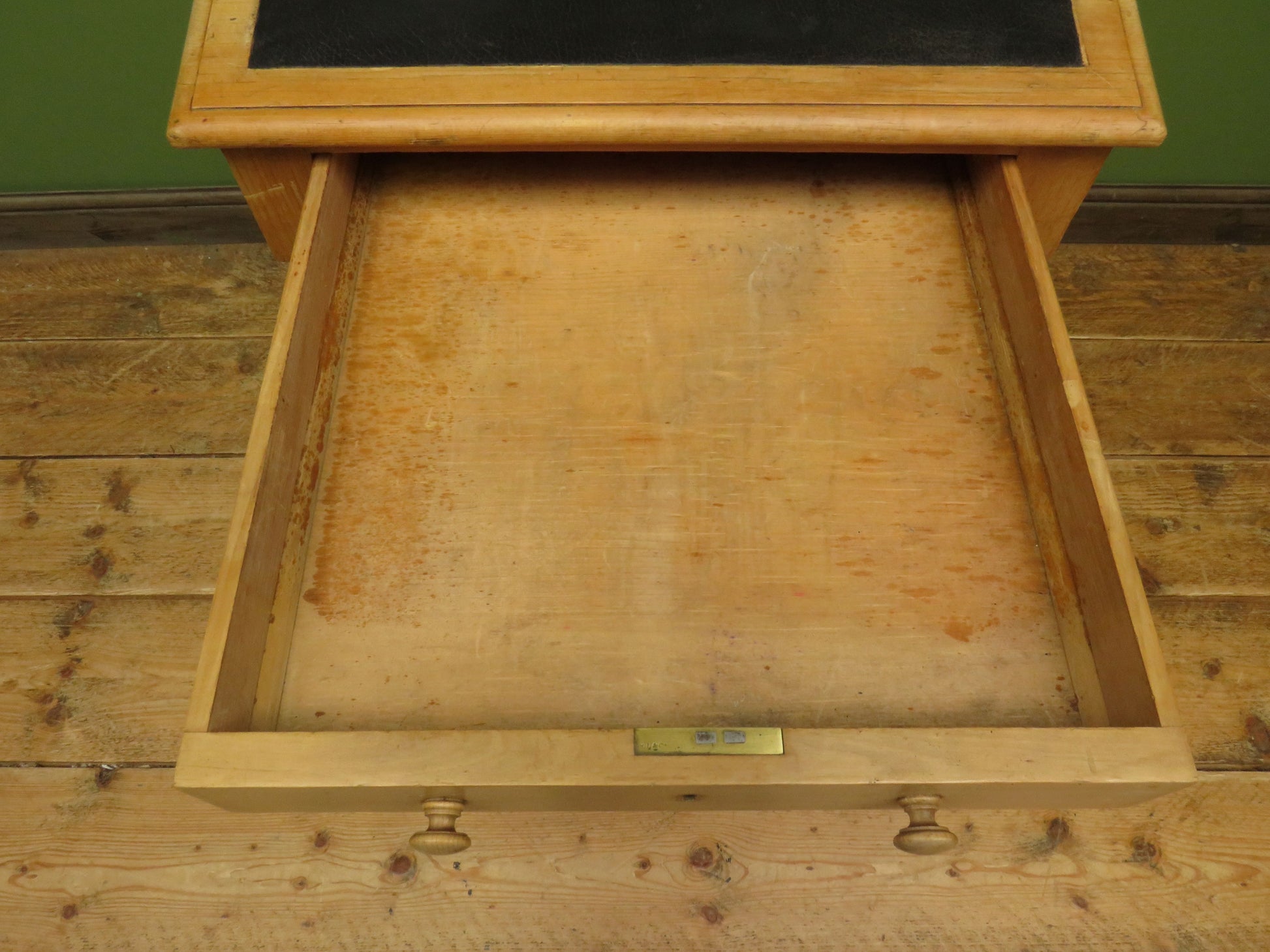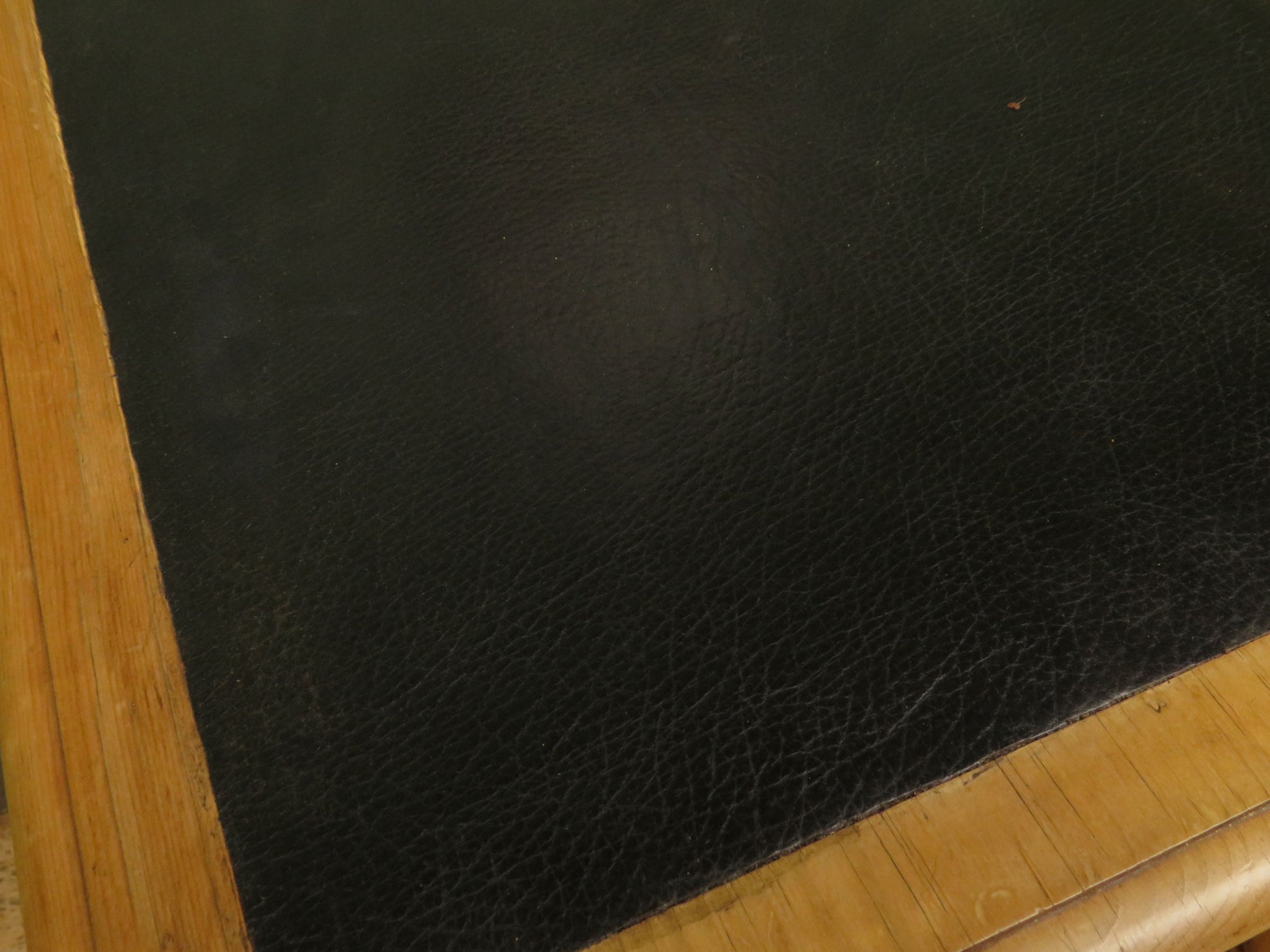 The desk is fairly tall and has a sloped top which is fitted with black leather. Beneath the desk top sits a single small drawer set over a useful under-tier.