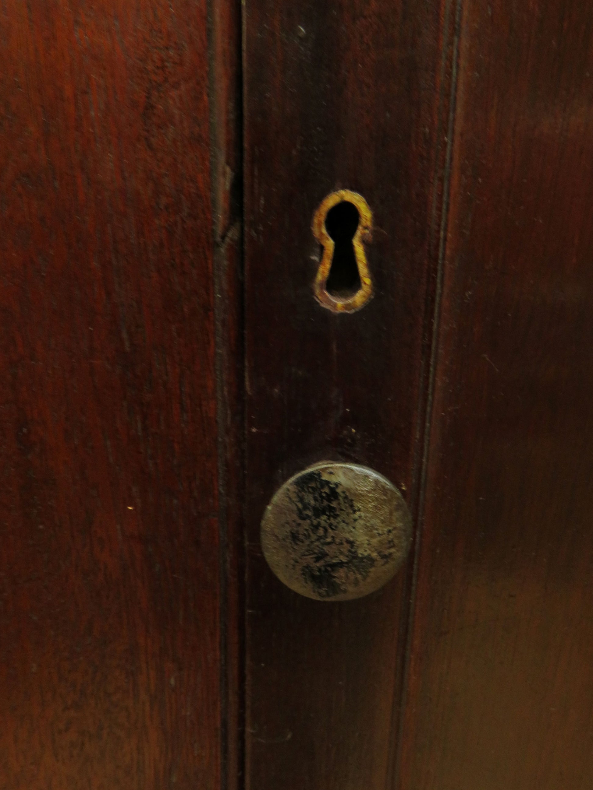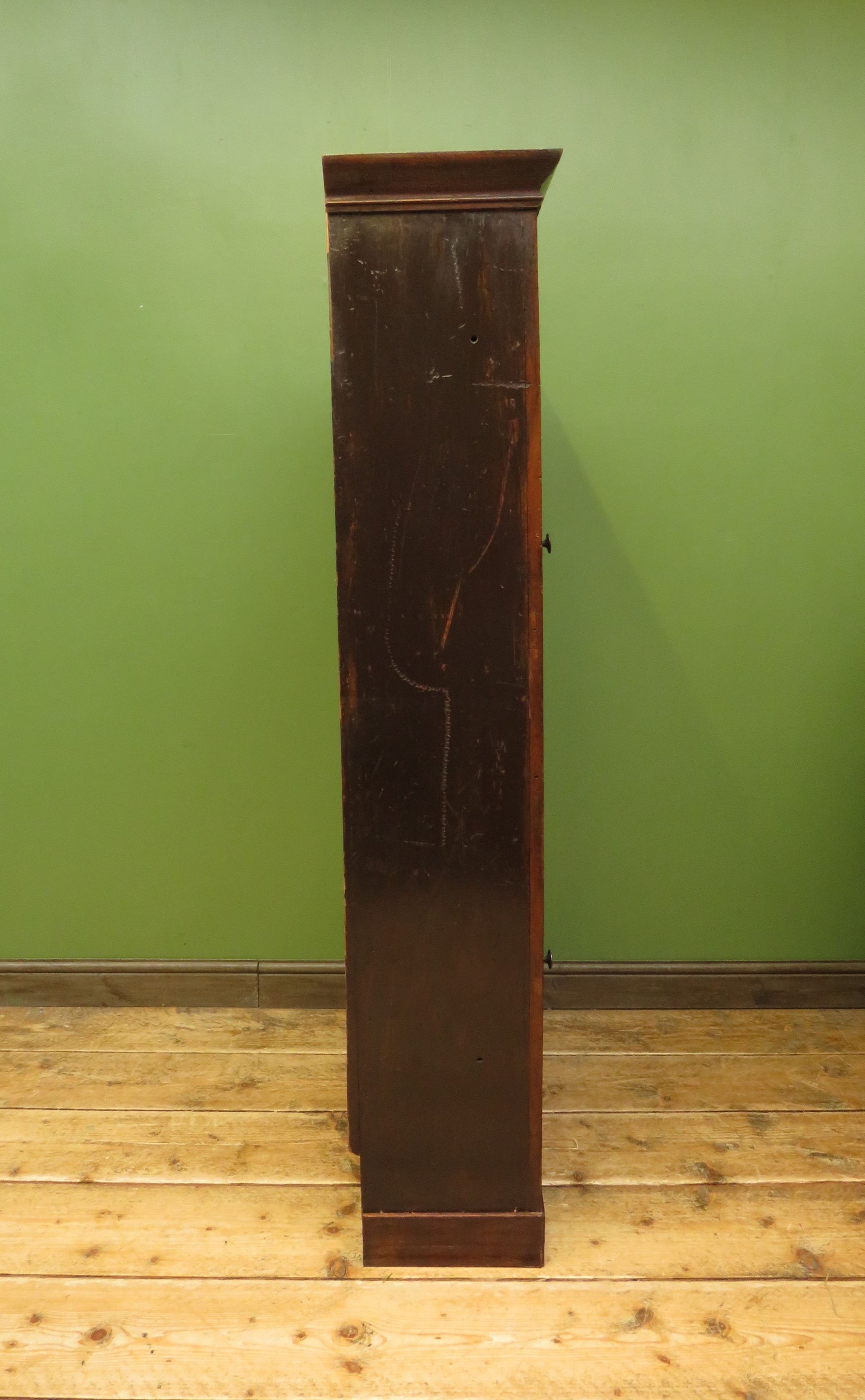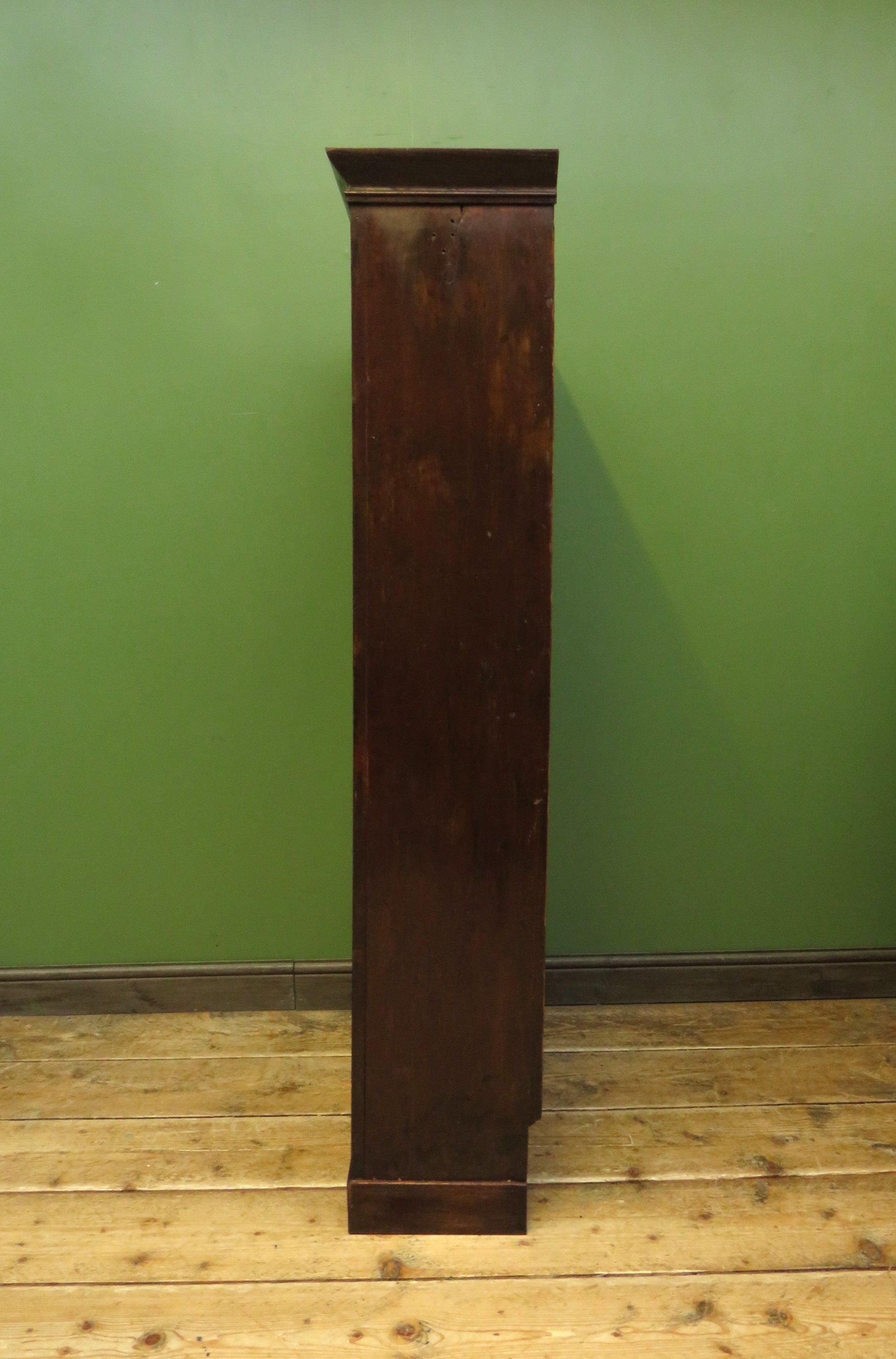 The back is shaped near the base to accommodate a tall skirting board and the cabinet has an old darkly stained finish which has a mid sheen.