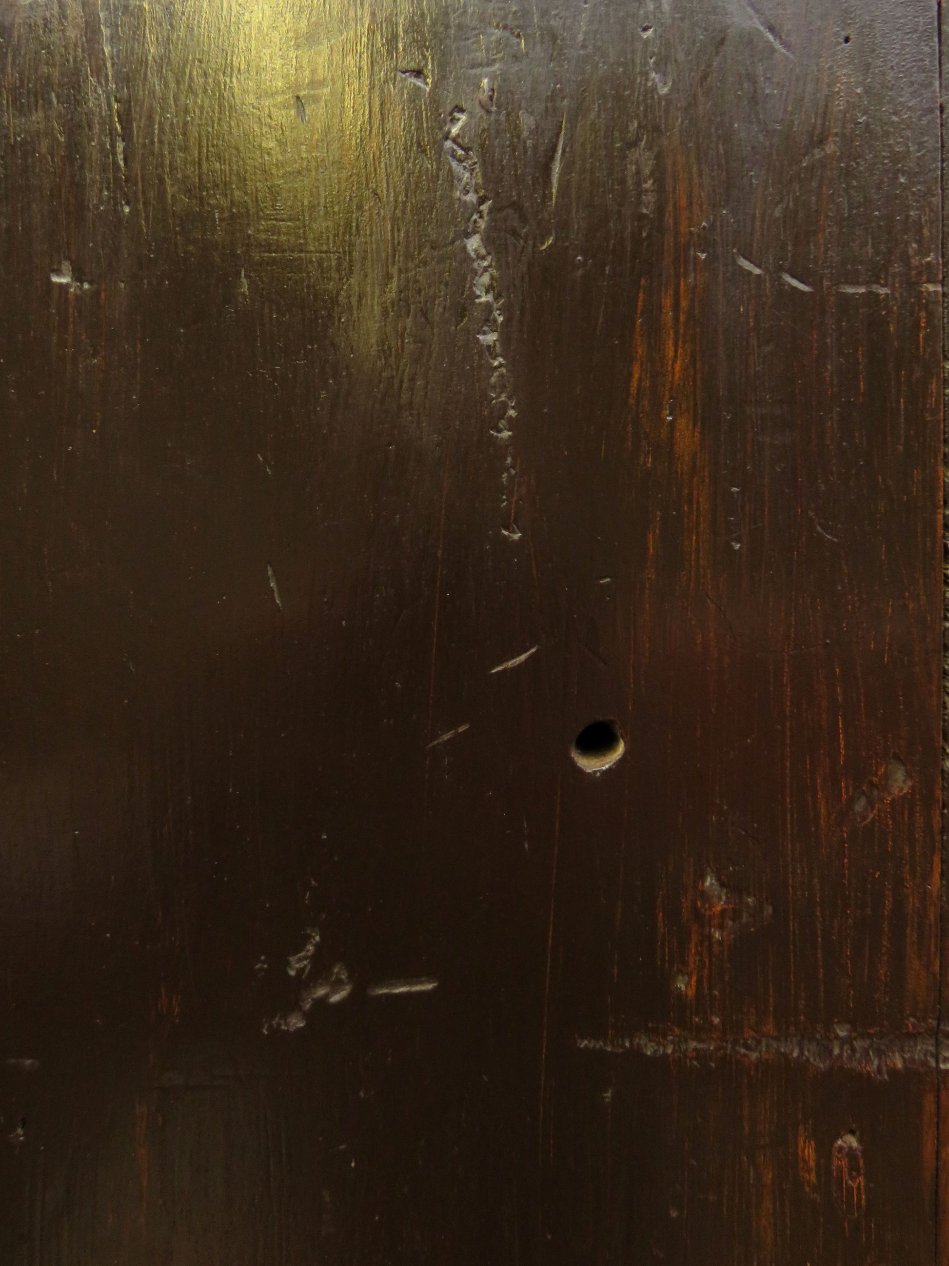 The cabinet is generally in solid structural condition with many cosmetic marks of age and use, including various scratches on the side panels.
