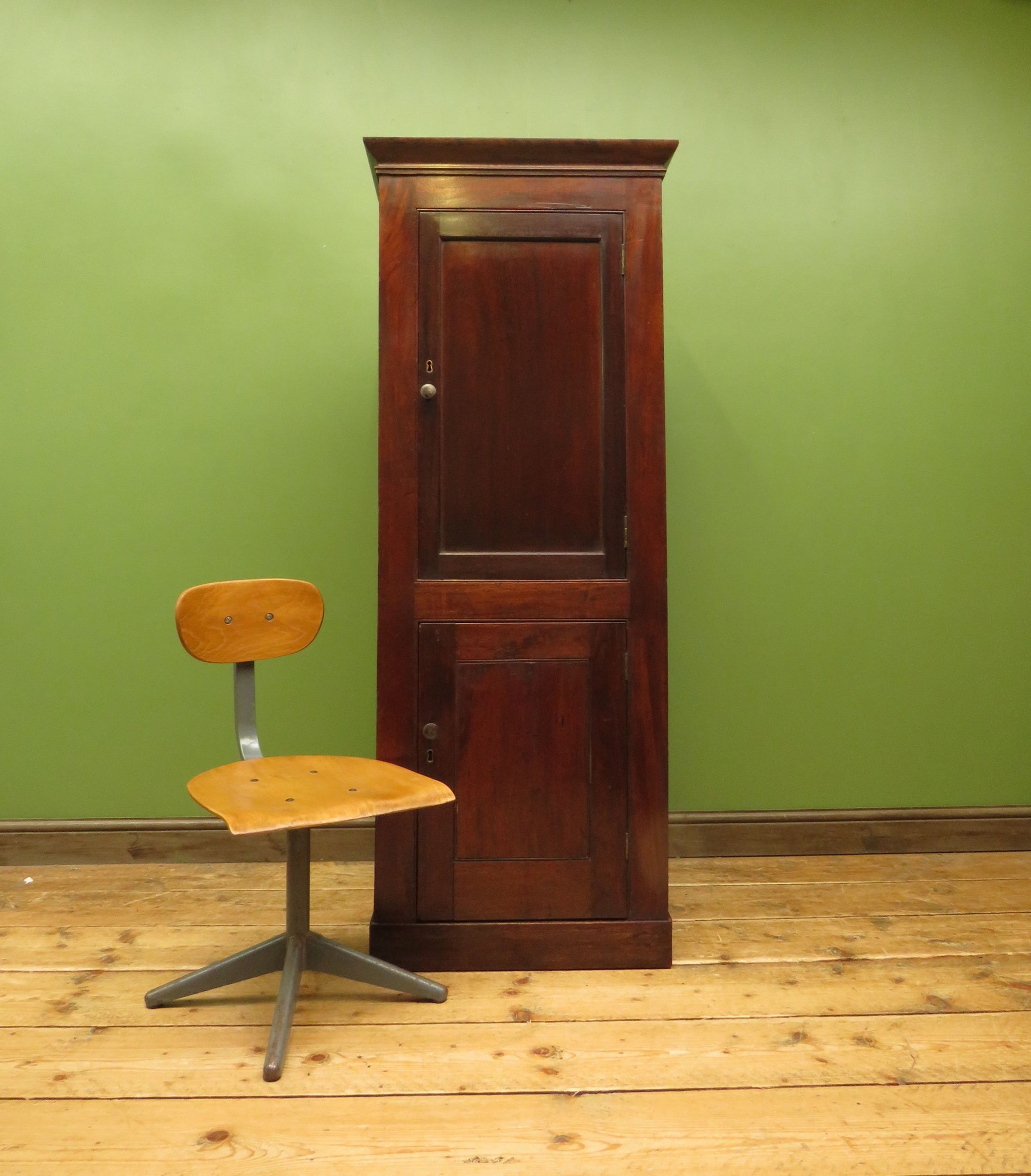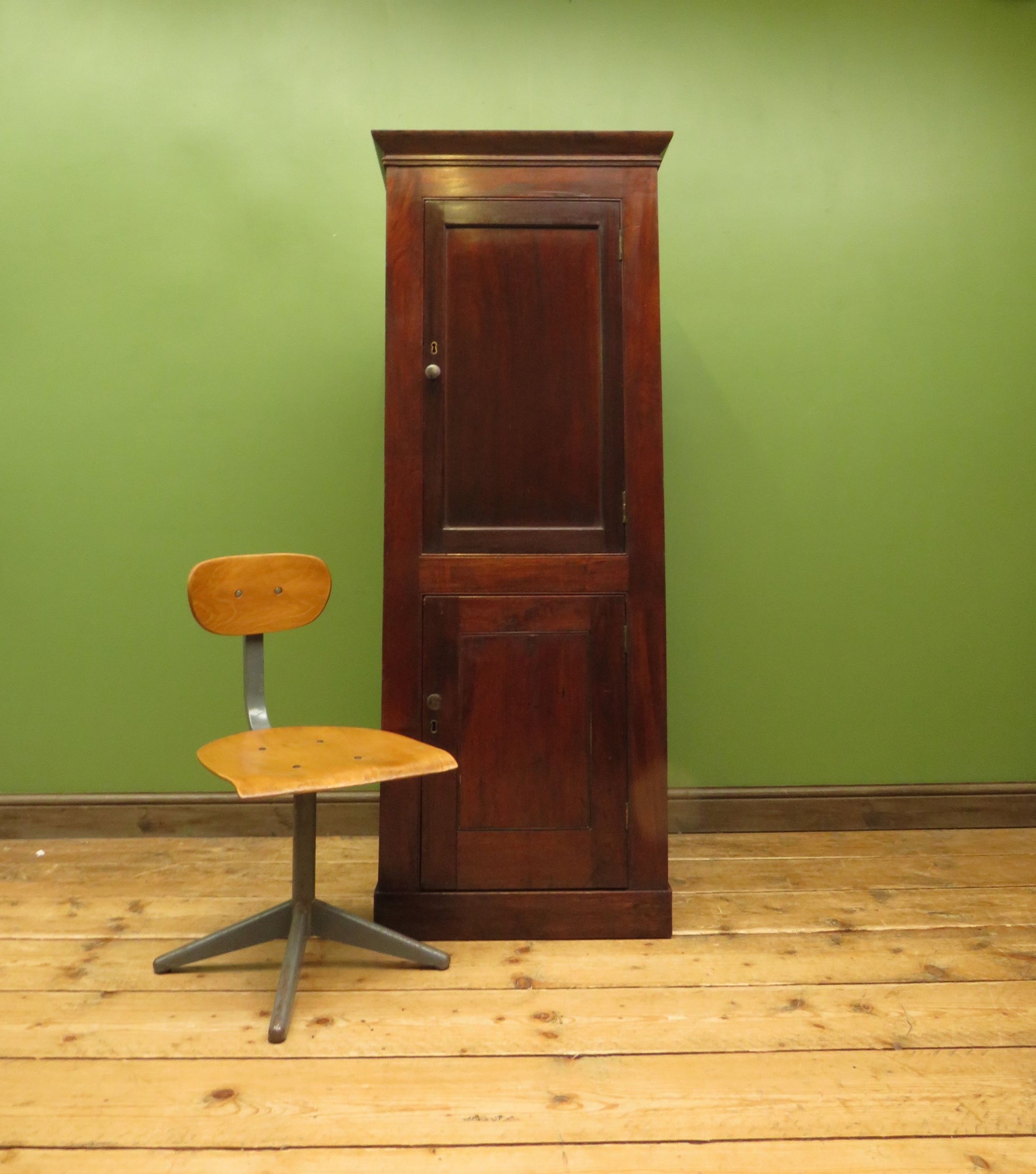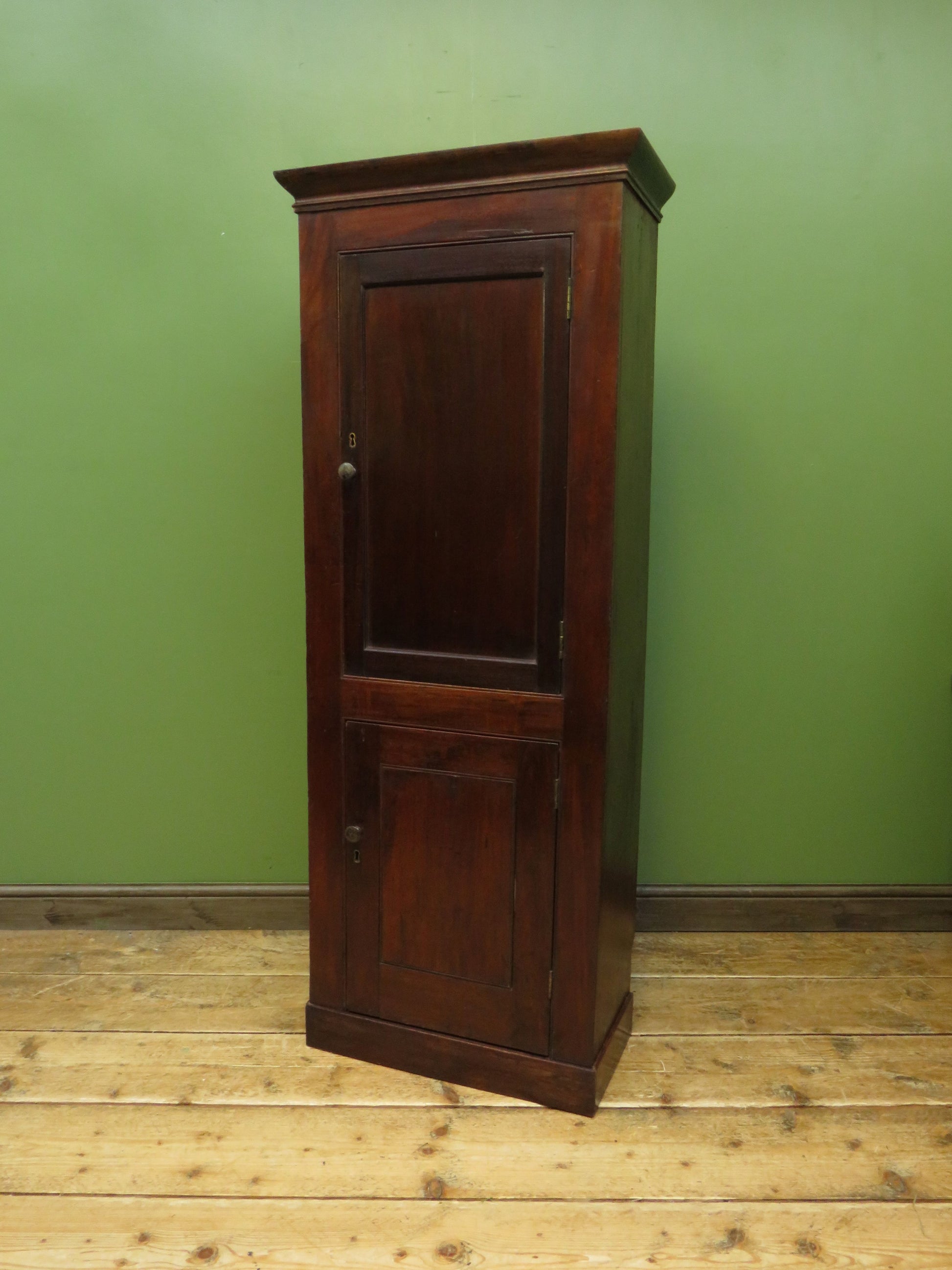 Made from mahogany and mixed woods the cabinet is tall, shallow and fairly narrow.