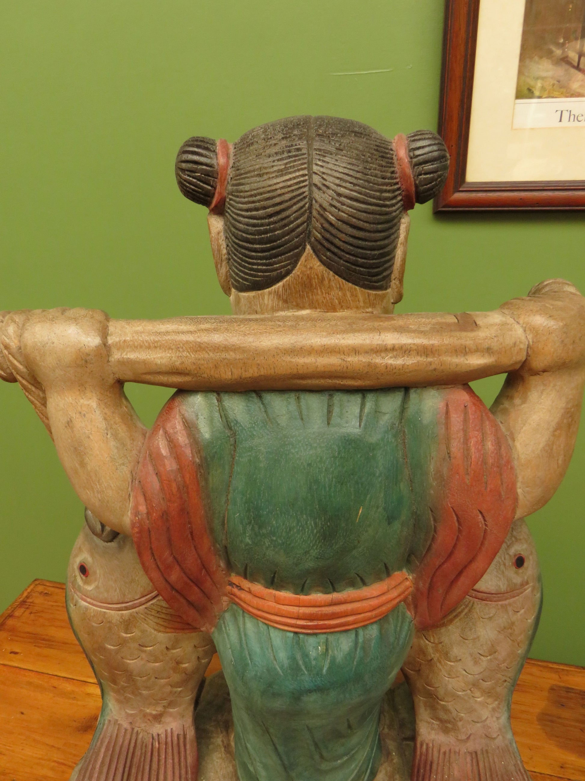 A large vintage wooden hand painted Asian figurine depicting a fish carrier with a yolk and two fish.